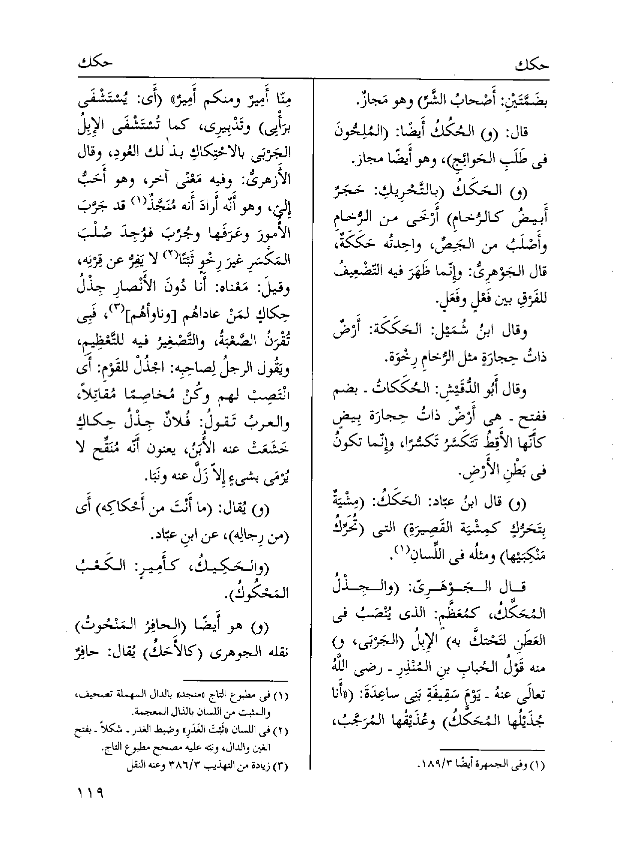 قَالَ الْجَوْهَرِي: والجِذْلُ {المُحَكَّكُ، كمُعَظَّمٍ: الَّذِي يُنْصَبُ فِي العَطَنِ} لتَحْتكَّ بِهِ الإِبِلُ الجَربَى، وَمِنْه قَوْلُ الحُبابِ بنِ المُنْذِرِ رَضِي اللَّهُ تعالَى عنهُ يَوْمَ سَقِيفَةِ بني ساعِدَةَ: أَنا جُذَيْلُها المُحَكَّكُ وعُذَيْقُها المُرَجَّبُ، مِنّا أَمِيرٌ ومنكم أَمِيرٌ أَي: يُستَشْفى برَأيي وتَدْبِيرِي، كَمَا تُستَشْفى الإِبِلُ الجَربَى {بالاحْتِكاكِ بذلك العودِ، وَقَالَ الْأَزْهَرِي: وَفِيه مَعْنًى آخر، وَهُوَ أَحَسبّ إِلي، وَهُوَ أَنّه أَرادَ أَنه مُنَجَّذٌ قد جَرَّبَ الأمورَ وعَرَفَها وجُرِّبَ فوُجِدَ صُلْبَ المَكْسَرِ غيرَ رِخْوٍ ثَبتاً لَا يَفِرُّ عَن قِرنِه، وقيلَ: مَعْناه: أَنا دُونَ الأَنْصارِ جِذْلُ} حِكاكٍ لمَنْ عاداهُم وناوأهُم، فَبِي تقْرَنُ الصَّعْبَةُ، والتَّصْغِيرُ فِيهِ للتَّعْظِيم، ويَقُول الرجلُ لِصاحِبِه: اجْذُلْ للقَوْمِ: أَي انْتَصِبْ لَهُم وكُنْ مُخاصِماً مُقاتِلاً، والعربُ تَقولُ: فلَان جِذْلُ حِكاكٍ خَشَعت عَنهُ الأُبَنُ، يعنون أَنّه مُنَقِّح لَا يُرمَى بشيءٍ إِلاّ زَلَّ عَنهُ ونَبَا. ويُقال: مَا أَنْتَ من {أَحْكاكِه أَي من رِجالِه، عَن ابنِ عبّاد.} والحَكِيكُ، كأَمِيرٍ: الكَعْبُ {المَحْكُوكُ. وَهُوَ أَيضاً الحافِرُ المَنْحُوت نَقله الْجَوْهَرِي} كالأَحَكِّ يُقال: حافِرٌ