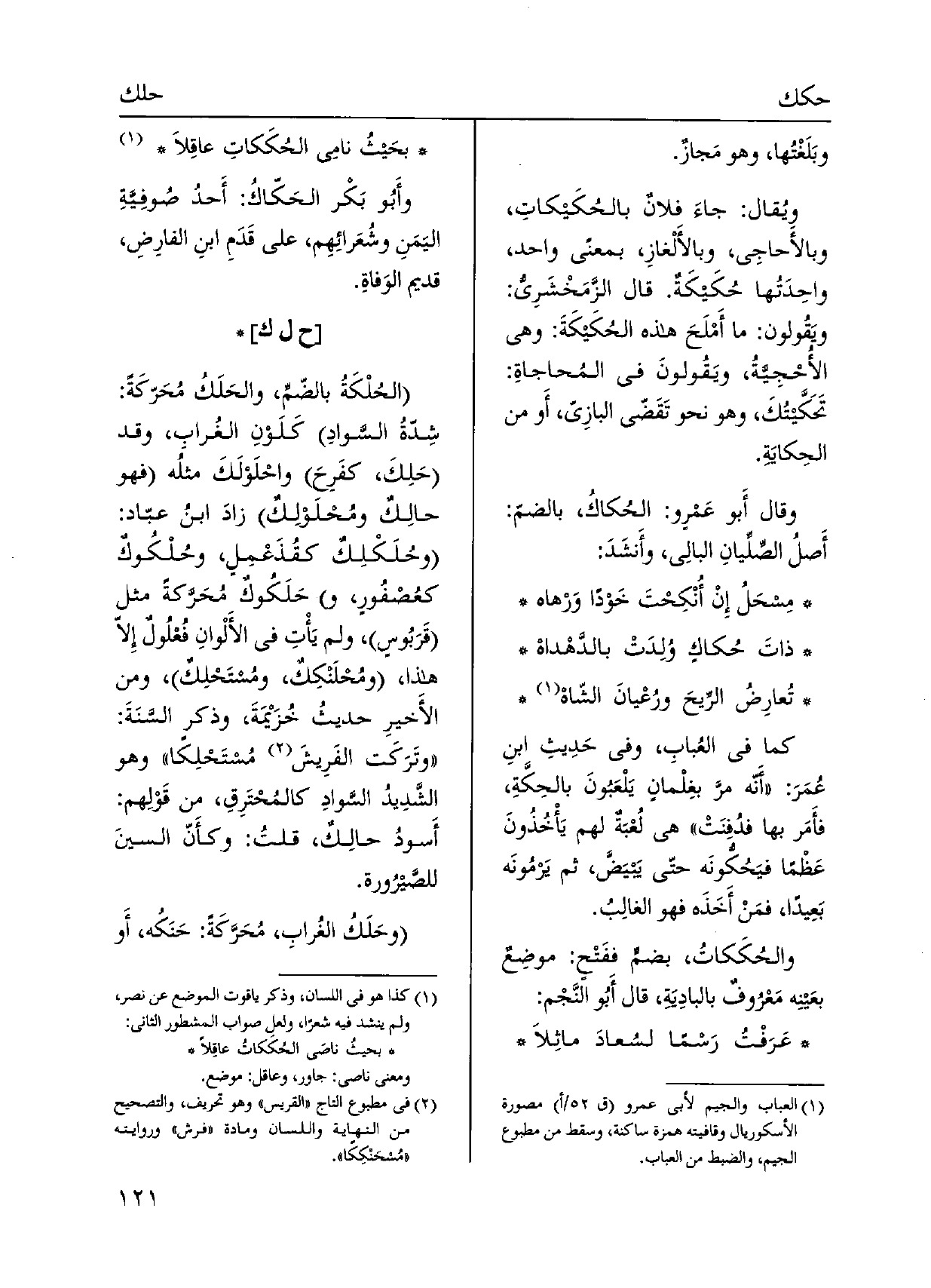 وبَلغْتُها، وَهُوَ مَجازٌ. ويُقال: جاءَ فلانٌ {بالحُكَيكاتِ، وبالأَحاجِي، وبالأَلْغازِ، بِمَعْنى وَاحِد، واحِدَتُها} حُكَيكَةٌ. قَالَ الزَّمَخْشَرِيُّ: ويَقُولون: مَا أَمْلَحَ هَذِه {الحُكَيكَةَ: وَهِي الأُحْجِيَّةُ، ويَقُولونَ فِي المُحاجاةِ:} تَحَكَّيتُكَ، وَهُوَ نَحْو تَقَضّى البازِيّ، أَو من الحِكايَةِ. وَقَالَ أَبو عَمْرو: {الحُكاكُ، بالضمّ: أَصلُ الصِّلِّيانِ البالِي، وأَنشَدَ: مِسحَلُ إِنْ أُنْكِحْتَ خَوْداً وَرْهاه ذاتَ} حُكاكٍ وُلِدَتْ بالدَّهْداهْ تُعارِضُ الريحَ ورُعْيانَ الشّاهْ كَمَا فِي العُبابِ، وَفِي حَدِيثِ ابنِ عُمَرَ: أَنّه مرَّ بغِلْمانٍ يَلْعَبُونَ {بالحِكَّةِ، فأَمَر بهَا فدُفِنَتْ هِيَ لُعْبَةٌ لَهُم يَأْخُذُونَ عَظْماً} فيَحُكُّونَه حتّى يَبيَضَّ، ثمَّ يَرمُونَه بَعِيداً، فمَنْ أَخَذَه فَهُوَ الغالِبُ. {والحُكَكات، بِضَم ففَتْحٍ: موضِعٌ بعَينِه مَعْرُوفٌ بالبادِيَةِ، قَالَ أَبُو النَّجْم: عَرَفْتُ رَسْماً لسُعادَ ماثِلاَ بِحَيْثُ نامِي} الحُكَكاتِ عاقِلاَ وأَبُو بَكْر! الحَكّاكُ: أَحدُ صُوفِيَّةِ اليَمَنِ وشُعَرائِهِم، على قَدَمِ ابنِ الفارِضِ، قديم الوَفاةِ.