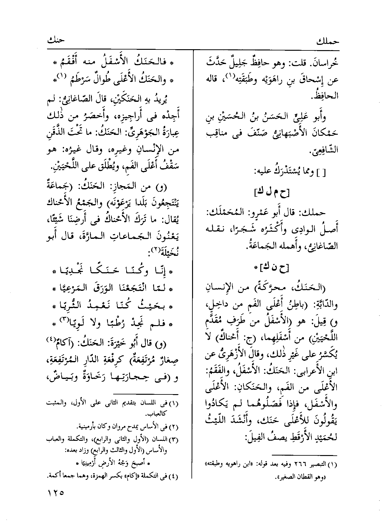 الحَنَكُ، محرَّكَةً من الإِنسانِ والدّابَّةِ: باطِنُ أَعْلَى الفَمِ من داخِلٍ، وقِيلَ: هُوَ الأَسْفَلُ من طَرَفِ مُقدَّمِ اللَّحْيَيْنِ من أَسْفَلِهما، أَحْناكٌ لَا يُكَسرُ على غَيرِ ذَلِك، وقالَ الْأَزْهَرِي عَن ابنِ الْأَعرَابِي: الحَنَكُ: الأَسْفَلُ، والفَقَمُ: الأعْلَى من الفَمِ، والحَنَكانِ: الأَعْلَى والأَسْفَل، فإِذا فَصَلُوهُما لم يَكادُوا يَقُولُونَ للأَعْلَى حَنَك، وأَنْشَدَ اللّيثُ لحُمَيدٍ الأَرْقَطِ يصفُ الفِيلَ: فالحَنَكُ الأَسْفَلُ مِنْهُ أَفْقَمُ والحَنَكُ الأَعْلَى طوالٌ سَرطَمُ يُريدُ بهِ الحَنَكَيْنِ، قالَ الصّاغاني: لم أَجِدْه فِي أَراجِيزِه، وأَخصَرُ من ذَلِك عِبارَةُ الْجَوْهَرِي: الحَنَكُ: مَا تَحْتَ الذَّقَنِ من الإنْسانِ وغيرِه، وَقَالَ غيرُه: هُوَ سَقف أَعْلَى الفَمِ، ويُطْلَق على اللَّحْيَين. وَمن المَجازِ: الحَنَكُ: جَماعَةٌ يَنتَجِعُونَ بَلَدا يَرعَوْنَه والجَمعُ الأَحْناك يُقال: مَا تَرَكَ الأَحْناكُ فِي أَرضِنَا شَيئاً، يَعْنُونَ الجَماعاتِ المارَّةَ، قَالَ أَبو نُخَيلَةَ: إِنّا وكُنّا حَنَكاً نَجْدِيّا لمّا انْتَجَعْنَا الوَرَقَ المَرعِيَّا بحَيثُ كُنّا نَعْمِدُ الثُّرِيّا فَلم نَجِدْ رُطْباً وَلَا لَوِيّا وَقَالَ أَبُو خَيرَةَ: الحَنَكُ: آكامٌ صِغارٌ مُرتَفِعَةٌ كرِفْعَةِ الدّارِ المُرتَفِعَةِ، وَفِي حِجارَتِها رَخَاوَةٌ وبَياضٌ،