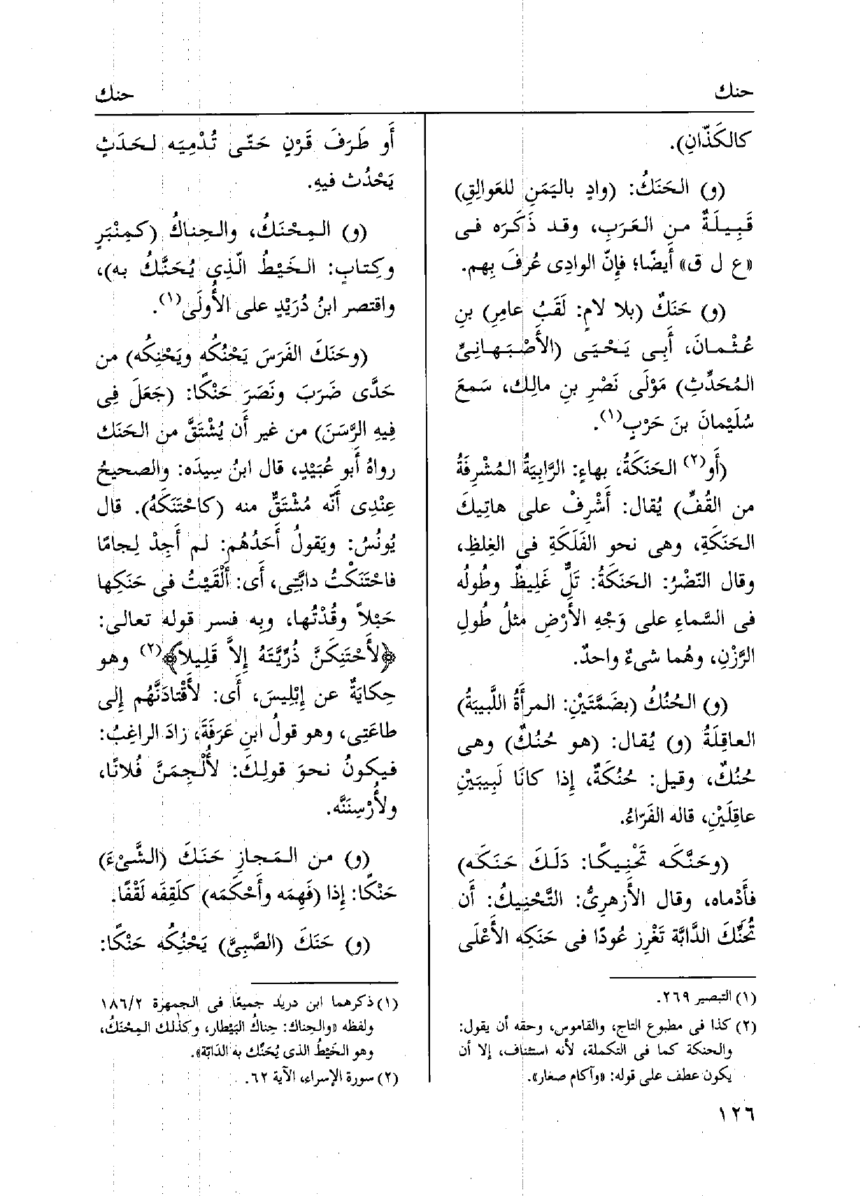 وحَنَكٌ بِلَا لامٍ: لَقَبُ عامِرِ بنِ عُثْمانَ، أبي يَحْيَى الأَصْبَهانِي المُحَدِّثِ مَوْلَى نَصْرِ بنِ مالِك، سَمعَ سُلَيمانَ بنَ حَربٍ. أَو الحَنَكَةُ، بهاءٍ: الرَّابِيَةُ المُشْرِفَةُ من القُفِّ يُقال: أَشْرِفْ على هاتِيكَ الحَنَكَةِ، وَهِي نَحْو الفَلَكَةِ فِي الغِلظِ، وَقَالَ النّضْرُ: الحَنَكَةُ: تَلٌّ غَلِيظٌ وطُولُه فِي السَّماءِ على وَجْهِ الأرْضِ مثلُ طُولِ الرَزْنِ، وهُما شيءٌ واحدٌ.)