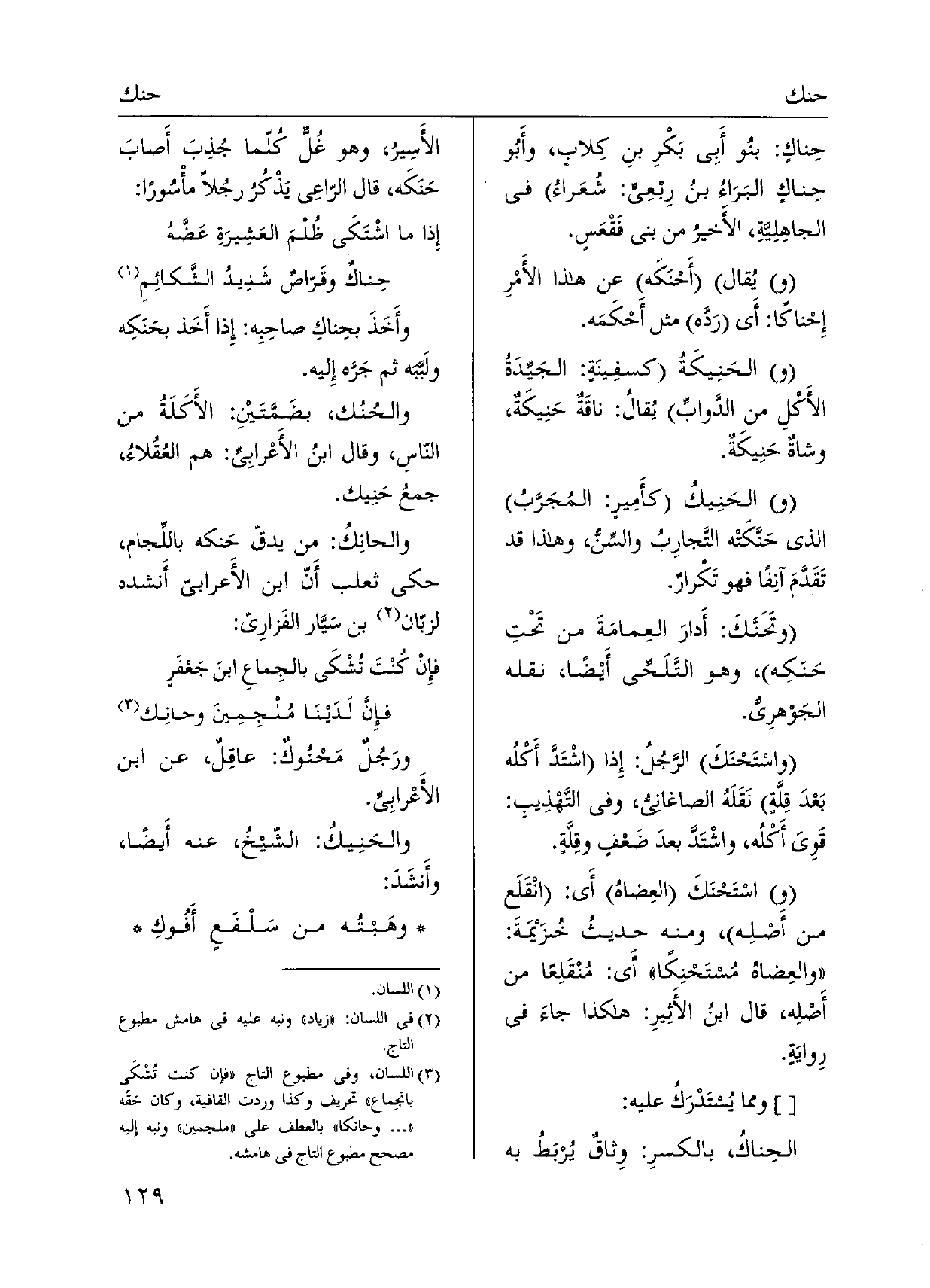 وأَخَذَ بحِناكِ صاحِبِه: إِذا أَخَذ بحَنَكِه ولَبَّبَه ثمَّ جَرَّه إِليه. والحُنُك، بضَمَّتَيْنِ: الأَكَلَةُ من النّاس، وَقَالَ ابنُ الْأَعرَابِي: هم العقُلاءُ، جمعُ حَنِيك.