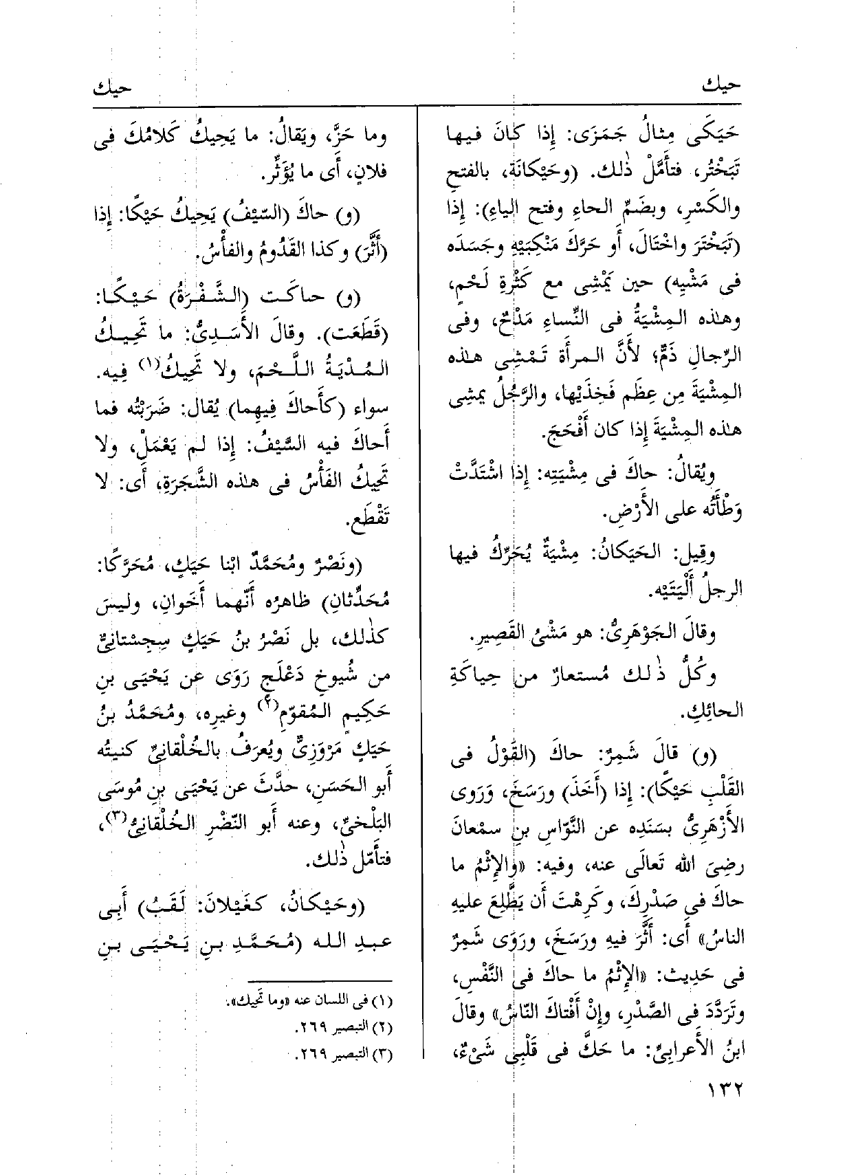 حاكَ الثَّوْبَ يَحِيكُ حَيكاً بالفتحِ وحَيَكاً وحِياكَةً: نسَجَه، والحِياكَةُ: صَنْعَتُه، قَالَه اللّيثُ، وغَلَّطَه الْأَزْهَرِي، وَقَالَ: إِنّما هُوَ حاكَه يَحوكُه حَوْكاً، لَا غير. وحاكَ الرّجُلُ فِي مِشْيَتِه يَحِيكُ حَيكاً وحَيَكاناً مُحَرَّكَةً، فَهُوَ حائِكٌ وحَيّاكٌ، وَهِي حَيّاكَةٌ وحَيَكَى، كجَمَزَى هَكَذَا فِي سائِرِ النسَخِ، وَهُوَ غَلَطٌ لأَنَّ حَيَكَى مُحَرَّكةً إِنَّما هُوَ فِي المَصادِرِ، كَمَا يَأْتِي عَن المُبَردِ، وأَمّا صِفَةُ المُؤَنَّثِ فَهِيَ حِيكَى بالكسرِ، قَالَ سِيبَوَيْهِ: امرأَةٌ حِيكَى، كضِيزَى، أَصْلُها حُيكَى، فكُرِهَت الياءُ بعد الضَّمّةِ، وكسِرت الحاءُ لتَسلَم الياءُ، والدَّلِيلُ على أَنّها فُعْلَى أَنَّ فِعْلَى لَا تَكُونُ صِفَةً أَلبتَّةَ، ونقلَ الصّاغانيُ عَن المُبَردِ: يقالُ: فِي مِشْيَتِه حَيَكَى مِثالُ جَمَزَى: إِذا كانَ فِيهَا تَبَخْتُر، فتأمَلْ ذَلِك. وحَيكانَة، بالفتحِ والكَسرِ، وبضَم الحاءِ وَفتح الياءِ: إِذا تَبَخْتَرَ واخْتَالَ، أَو حرّكَ مَنْكِبَيهِ وجَسَدَه فِي مَشْيِه حِين يَمْشِي مَعَ كَثْرةِ لَحْمٍ، وَهَذِه المِشْيَةُ فِي النِّساءِ مَدْحٌ، وَفِي الرِّجالِ ذَمٌّ لأَنَّ المرأَة تَمْشِي هَذِه المِشْيَةَ مِن عِظَم فَخِذَيْها، والرَّجُلُ يمشِي هَذِه المِشْيَةَ إِذا كَانَ أَفْحَجَ. ويُقالُ: حاكَ فِي مِشْيَتِه: إِذا اشْتَدَّتْ وَطْأته على الأَرْضِ. وقِيل: الحَيَكانُ: مِشْيَةٌ يُحَركُ فِيهَا الرجل أَلْيَتَيه.