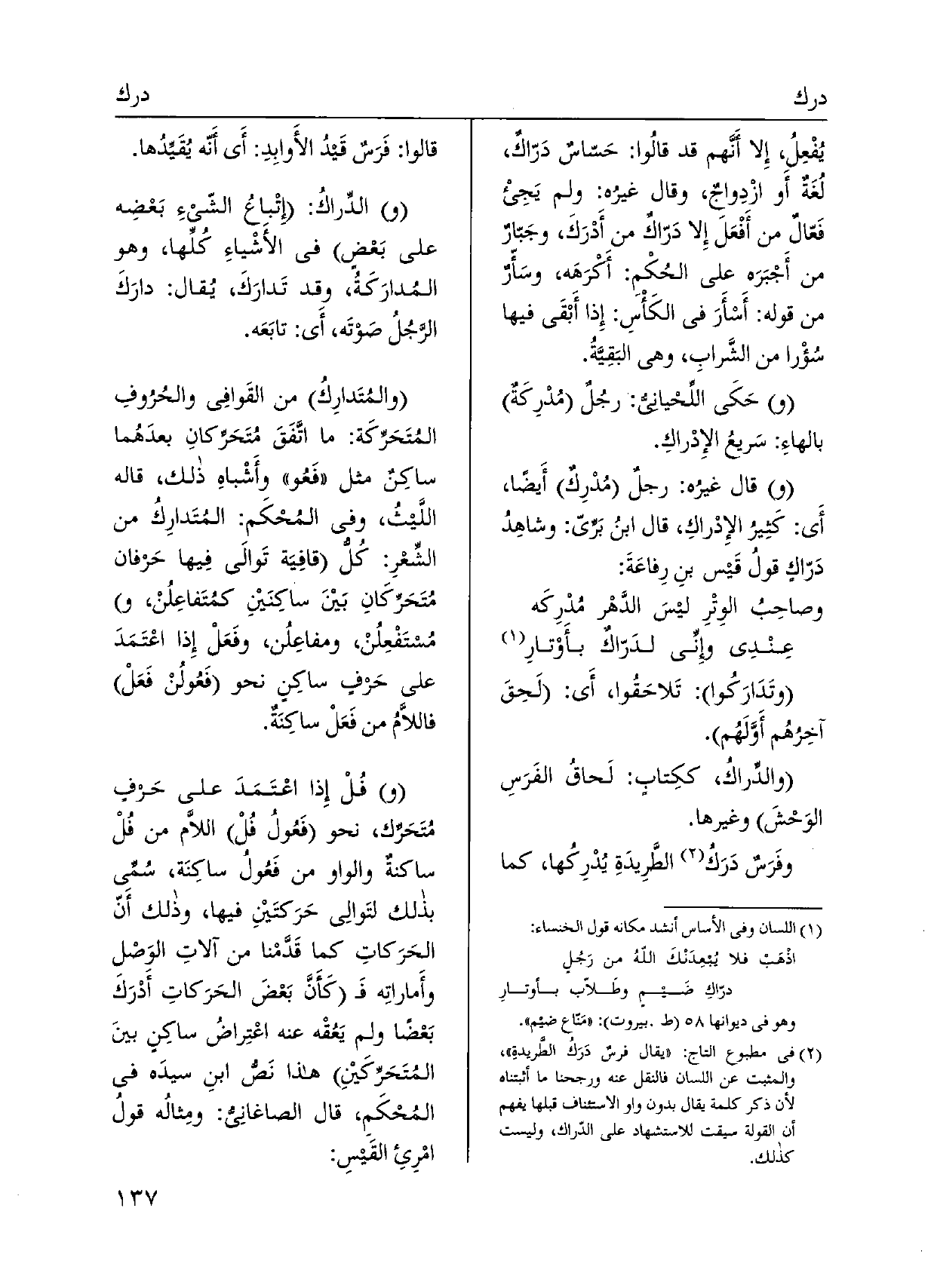الدَّرَكُ، مُحَرَّكَةً: اللَّحاقُ، وَقد أَدْرَكَه: إِذا لَحِقَه وَهُوَ اسمٌ من الإدْراكِ، وَفِي الصِّحاحِ الإِدْراكُ: اللُّحُوقُ، يُقال: مَشَيت حَتَّى أَدْرَكْتُه، وعِشْتُ حَتَّى أَدْرَكْتُ زمانَه. ورَجُلٌ دَرّاكٌ: كثيرُ الإدْراكِ، قَالَ الْجَوْهَرِي: وقَلّما يَجِئُ فَعّالٌ من أَفْعَلَ يُفْعِلُ، إِلا أَنَّهم قد قالُوا: حَسّاسٌ دَرّاكٌ، لُغَةٌ أَو ازْدِواجٌ، وَقَالَ غيرُه: وَلم يَجِئْ فَعّالٌ من أَفْعَلَ إِلا دَرّاكٌ من أَدْرَكَ، وجَبّارٌ من أَجْبَرَه على الحُكْمِ: أَكْرَهَه، وسَأّرٌ من قَوْله: أَسْأَرَ فِي الكَأْسِ: إِذا أَبْقَى فِيهَا سُؤْرا من الشَّرابِ، وَهِي البَقِيَّةُ. وحَكَى اللِّحْياني: رجُلٌ مُدْرِكَةٌ بالهاءِ: سَريعُ الإِدْراكِ. وَقَالَ غيرُه: رجلٌ مُدْرِكٌ أَيضاً، أَي: كَثِيرُ الإِدْراكِ، قَالَ ابنُ بَرّيّ: وشاهِدُ درّاكٍ قولُ قَيس بنِ رِفاعَةَ: