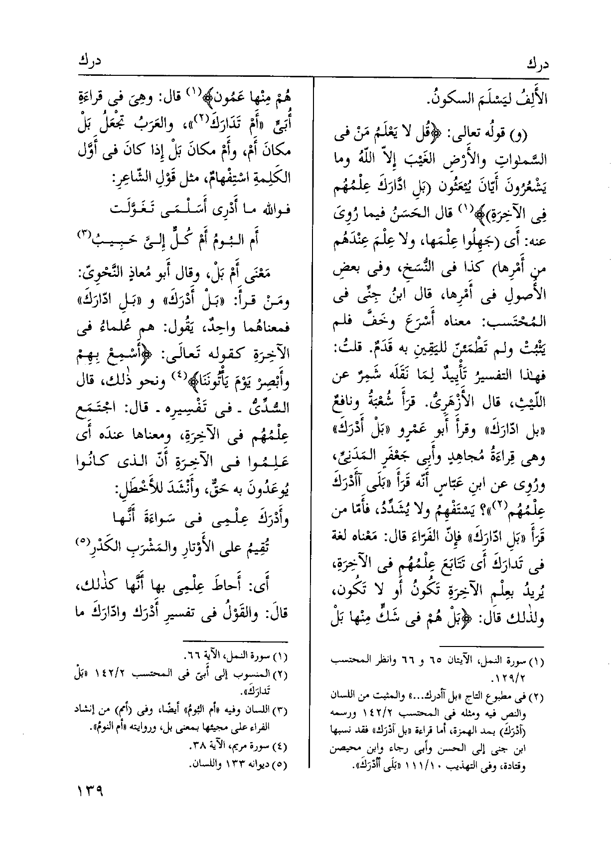المُحْتَسب: مَعْنَاهُ أَسْرَعَ وخَفَّ فَلم يَثْبُتْ وَلم تَطْمَئنّ لليَقِينِ بِهِ قَدَمٌ. قلتُ: فَهَذَا التفسيرُ تَأْيِيدٌ لِمَا نَقَلَه شَمِرٌ عَن اللّيثِ، قَالَ الْأَزْهَرِي. قرَأَ شُعْبَةُ ونافعٌ بل ادّارَكَ وقرأَ أَبو عَمْرو بَلْ أَدْرَكَ وَهِي قِراءَةُ مجاهِدٍ وَأبي جَعْفَرٍ المَدَني، ورُوِى عَن ابنِ عَبّاسٍ أَنّه قَرَأَ بَلَى آأَدْرَكَ عِلْمُهُم يَستَفْهِمُ وَلَا يُشَدِّدُ، فأَمّا من قَرَأَ بَلِ ادّارَكَ فإِنّ الفَرّاءَ قَالَ: مَعْناه لُغَة فِي تَدارَكَ أَي تَتَابَعَ عِلْمُهُمِ فِي الآخِرَةِ، يُريدُ بعِلْمِ الآخِرَةِ تَكُونُ أَو لَا تَكُون، وَلذَلِك قَالَ: بَلْ هُم فِي شَك مِنْها بَلْ هُم مِنْها عَمون قَالَ: وَهِي فِي قراءةِ أُبَي أَمْ تَدَارَكَ، والعَرَبُ تجْعَلُ بَلْ مكانَ أَمْ، وأَمْ مكانَ بَلْ إِذا كانَ فِي أَوَّل الكَلِمةِ اسْتِفْهامٌ، مثل قَوْلِ الشّاعِرِ: