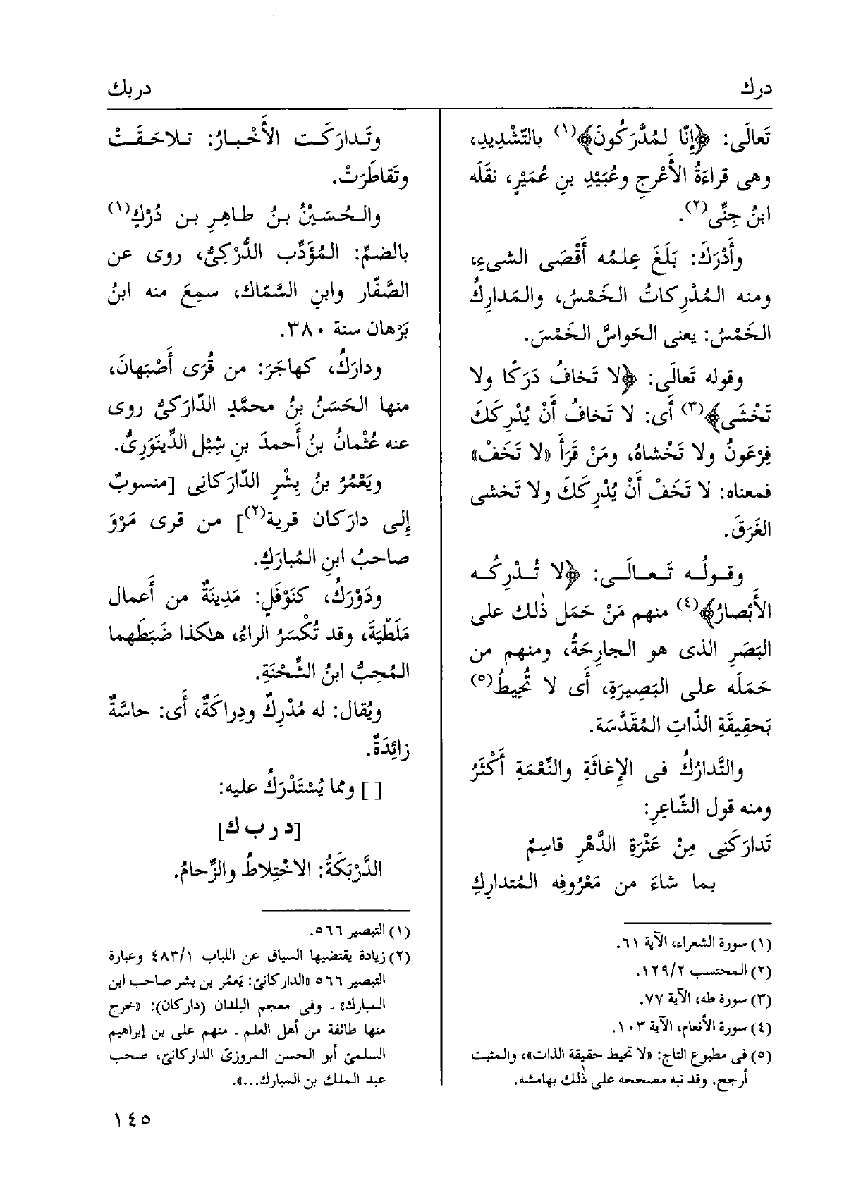 تَعالَى: إِنّا لمُدّرَكُونَ بالتّشْدِيدِ، وَهِي قراءةُ الأَعْرجِ وعُبَيدِ بنِ عُمَيرٍ، نقَلَه ابنُ جِني. وأَدْرَكَ: بَلَغَ عِلمُه أَقْصَى الشَّيْء، وَمِنْه المُدْرِكاتُ الخَمْسُ، والمَدارِكُ الخَمْسُ: يَعْنِي الحَواسَّ الخَمْسَ. وَقَوله تَعالَى: لَا تَخافُ دَرَكاً وَلَا تَخْشَى أَي: لَا تَخافُ أَنْ يُدْرِكَكَ فِرعَونُ وَلَا تَخْشاهُ، ومَنْ قَرَأَ لَا تَخَف فَمَعْنَاه: لَا تَخَفْ أَنْ يُدْرِكَكَ وَلَا تَخشى الغَرَقَ. وقولُه تَعالَى: لَا تُدْرِكُه الأَبْصارُ مِنْهُم مَنْ حَمَل ذَلِك على البَصَرِ الَّذِي هُوَ الجارِحَةُ، وَمِنْهُم من حَمَلَه على البَصِيرَةِ، أَي لَا تُحِيطُ بَحقِيقَةِ الذّاتِ المُقدَّسَة. والتَّدارُكُ فِي الإِغاثَةِ والنِّعْمَةِ أَكْثَر وَمِنْه قَول الشّاعِرِ:
