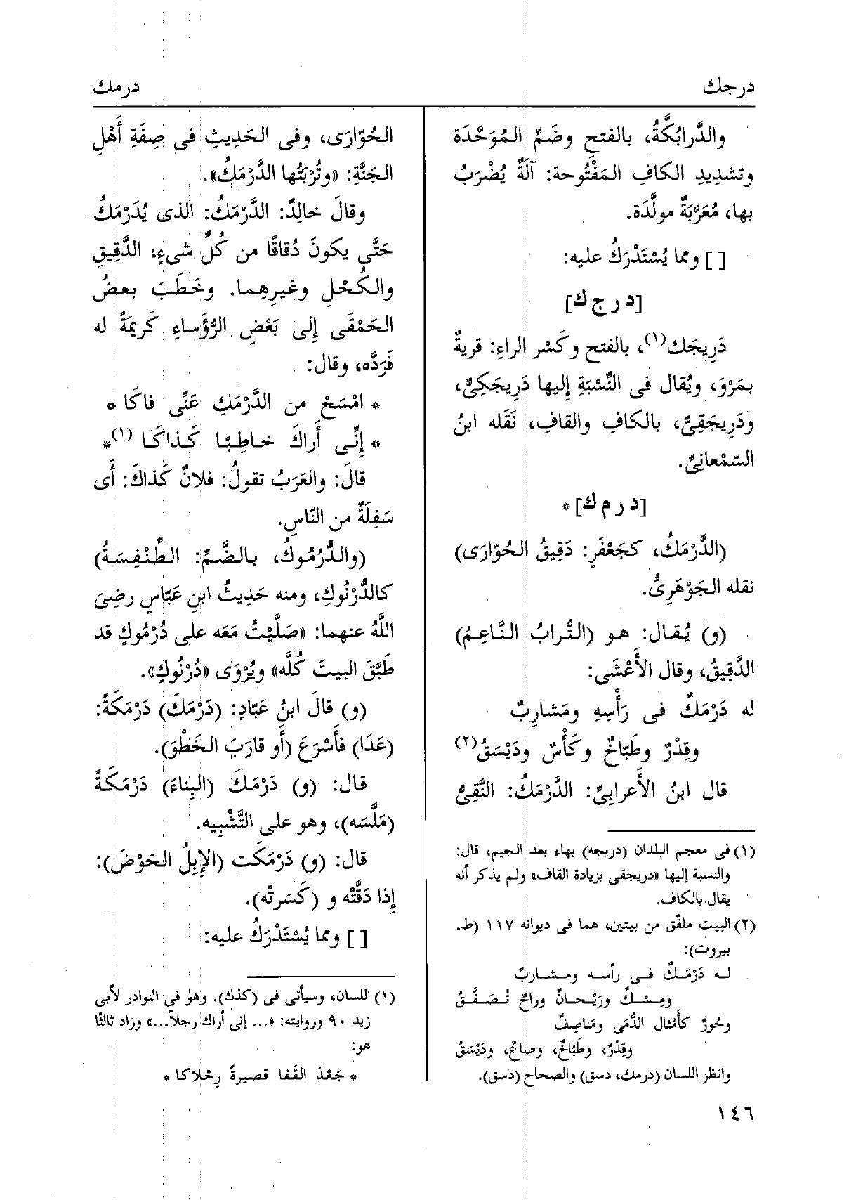 قَالَ ابنُ الأَعرابِي: الدَّرْمَك: النَّقِيُّ لحُوّارَى، وَفِي الحَدِيثِ فِي صِفَةِ أَهْلِ الجَنَّةِ: وتُربَتُها الدَّرْمَكُ. وقالَ خالِدٌ: الدَّرْمَكُ: الَّذِي يُدَرْمَكُ حَتَّى يكونَ دُقاقاً من كُلِّ شيءٍ، الدَّقِيقِ والكُحْلِ وغيرِهِما. وخَطَبَ بعضُ الحَمقى إِلى بَعْض الرؤَساءِ كَريمَةً لَهُ فَرَدَه، وَقَالَ: امْسَحْ من الدَّرْمَكِ عَنّي فاكَا إِنّي أَراكَ خاطِباً كَذاكَا قالَ: والعَرَبُ تقولُ: فلانٌ كَذاكَ: أَي سَفِلَةٌ من النّاسِ. والدّرُمُوكُ، بالضَّمِّ: الطِّنْفِسَه كالدُّرنُوكِ، وَمِنْه حَدِيث ابنِ عَبّاسٍ رَضِي اللَّهُ عَنْهُمَا: صَلَّيتُ مَعَه على دُرْمُوكٍ قد طَبَّقَ البيتَ كُلَّه ويُرَى دُرْنُوكٍ. وقالَ ابنُ عَبّادٍ: دَرْمَكَ دَرْمَكَةً: عَدَا فأَسْرَعَ أَو قارَبَ الخَطْوَ. قَالَ: ودَرْمَكَ البِناءَ دَرْمَكَةً مَلَّسَه، وَهُوَ على التَّشْبِيه. قَالَ: ودَرْمَكَت الإِبِلُ الحَوْضَ: إِذا دَقَّتْه وكَسَرتْه.