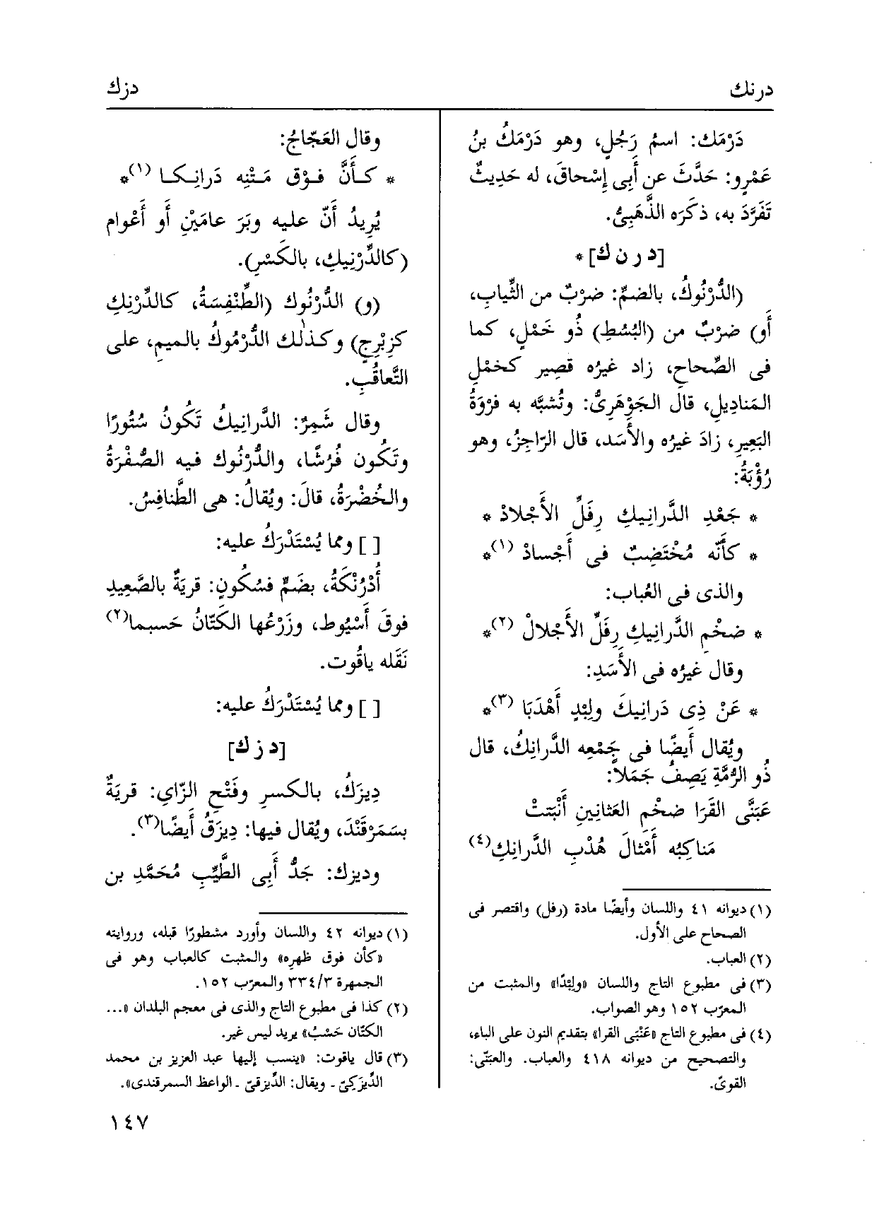 وَقَالَ العَجّاج: كأَنَّ فوْق مَتْنِه دَرانِكا يُرِيدُ أَنّ علية وبَرَ عامَين، أَو أَعْوام كالدِّرنِيكِ، بالكَسرِ. والدّرنوك الطِّنفِسَةُ، كالدرْنكِ كزِبْرِجِ وَكَذَلِكَ الدّرمُوك بالميمِ، على التَّعاقب. وَقَالَ شَمِرٌ: الدَّرانِيكُ تَكونُ ستوراً وتَكُون فُرشاً، والدُّرْنُوك فِيهِ الصُّفْرَةُ والخُضْرَة، قالَ: ويُقالُ: هِيَ الطَّنافِس.