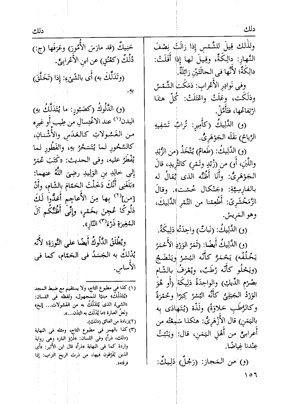 وَلذَلِك قِيلَ للشَّمْسِ إِذا زالَتْ نِصْفَ النَّهارِ: دالِكَةٌ، وقِيلَ لَهَا إِذا أَفَلَتْ: دالِكَةٌ لأَنَّها فِي الحالَتَيْنِ زائِلَةٌ. وَفِي نَوادَرِ الأَعْرابِ: دَمَكَت الشَّمسُ ودَلَكَت، وعَلَتْ واعْتَلَتْ: كلّ هَذَا ارْتِفاعُها، فتَأَمَّلْ. والدَّلِيكُ كأَمِيرٍ: تُرابٌ تَسفيهِ الرِّياحُ نقَلَه الْجَوْهَرِي. والدَّلِيكُ: طَعامٌ يُتَّخَذُ من الزُّبْدِ واللَّبنَ، أَو من زُبْدٍ وتَمْرٍ كالثَّرِيدِ، قالَ الْجَوْهَرِي: وأَنَا أَظُنُّه الَّذِي يُقالُ لَهُ بالفارِسِيَّةِ: جَنْكال خُست. وقالَ الزَّمَخْشَرِيّ: أَطْعِمْنا من التَّمْرِ الدَّلِيكَ، وَهُوَ المَرِيسُ. والدَّلِيكُ: نَباتٌ واحِدَتُه دَلِيكَةٌ. والدَّلِيكُ أَيضاً: ثَمَرُ الوَرْدِ)