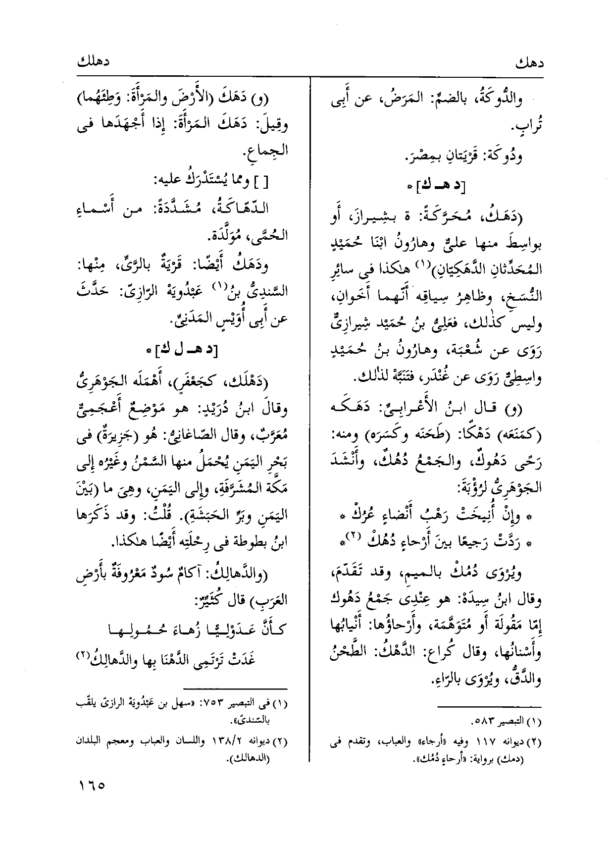 دَهَكُ، مُحَرَّكَةً: بشِيرازَ، أَو بواسِطَ مِنْهَا عليٌّ وهارُونُ ابْنَا حُمَيدٍ المُحَدِّثانِ الدَّهَكِيّانِ هَكَذَا فِي سائِرِ النُّسَخِ، وظاهِرُ سِياقِه أَنّهما أَخَوانِ، وَلَيْسَ كَذَلِك، فعَلِيُ بنُ حُمَيد شِيرازِيٌّ رَوَى عَن شُعْبَة، وهارُونُ بنُ حُمَيدٍ واسِطِيٌ رَوَى عَن غُنْدَر، فتَنَبَّهْ لذْلك. وَقَالَ ابنُ الْأَعرَابِي: دَهَكَه كمَنَعَه دهْكًا: طَحَنَه وكَسَرَه وَمِنْه: رَحًى دَهُوكٌ، والجَمْعُ دُهُكٌ، وأَنْشَدَ الجَوْهرِيُّ لرُؤْبَةَ: وِإنْ أنِيخَتْ رَهْبُ أَنْضاءٍ عرُكْ رَدَّتْ رَجيعًا بينَ أَرْحاءٍ دُهُكْ ويُروَى دُمُكْ بالميمِ، وَقد تَقَدّمَ، وَقَالَ ابنُ سِيدَهْ: هُوَ عِنْدِي جَمْعُ دهُوك إِمّا مَقُولَة أَو مُتَوَهَّمَة، وأَرْحاؤُها: أَنْيابُها وأَسْنانُها، وَقَالَ كُراع: الدَّهْكُ: الطَّحْنُ والدَّقُّ، ويُروَى بالرّاءِ. ودَهكَ الأرْضَ والمَرأةَ: وَطِئَهُما وقِيلَ: دَهَكَ المَرأَةَ: إِذا أَجْهَدَها فِي الجِماعِ.