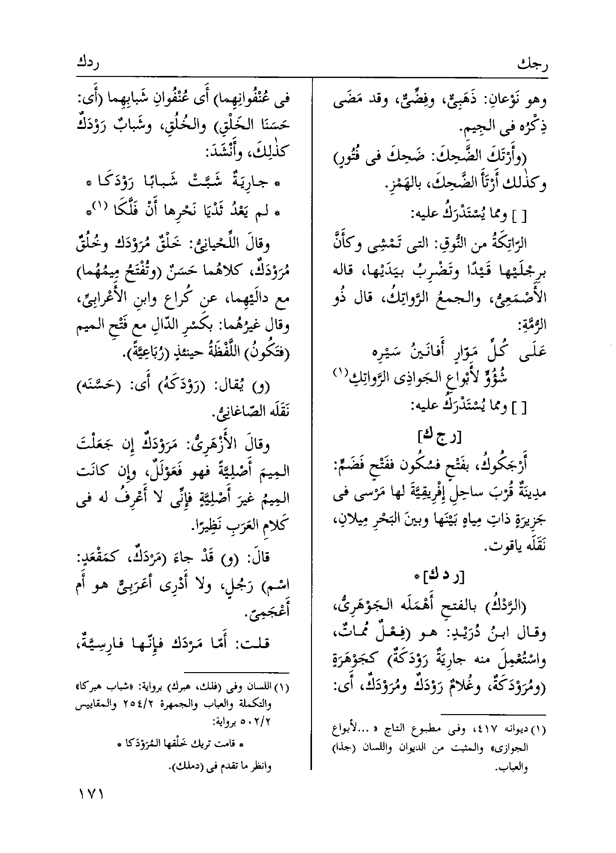 الرَّدْكُ بالفتحِ أَهْمَلَه الْجَوْهَرِي، وَقَالَ ابنُ دُرَيْدٍ: هُوَ فِعْلٌ مُماتٌ، واسْتعْمِلَ مِنْهُ جارِيَةٌ رَوْدَكَةٌ كجَوْهَرَةٍ ومُرَوْدَكَةٌ، وغُلامٌ رَوْدَكٌ ومُرَوْدَكٌ، أَي: فِي عُنْفُوانِهِما أَي عُنْفُوانِ شَبابِهما أَي: حَسَنَا الخَلْقِ والخُلُقِ، وشَبابٌ رَوْدَكٌ كذلِكَ، وأَنْشَدَ: جارِيَةٌ شَبَّتْ شَبابًا رَوْدَكَا لم يَعْدُ ثَدْيَا نَحْرِها أَنْ فَلَّكَا وقالَ اللِّحْيانيُ: خَلْقٌ مُرَوْدَك وخُلُقٌ مُرَوْدَك، كلاهُما حَسَنٌ وتُفْتَحُ مِيمُهُما مَعَ دالَيهِما، عَن كُراع وابنِ الأَعْرابِي، وَقَالَ غيرُهُما: بكَسرِ الدّالِ معٍ فَتْحِ الْمِيم فتَكُونُ اللَّفْظَةُ حينئذٍ رُبَاعِيَّة. ويُقال: رَوْدَكَهُ أَي: حَسَّنَه نَقَلَه الصّاغانيُ.