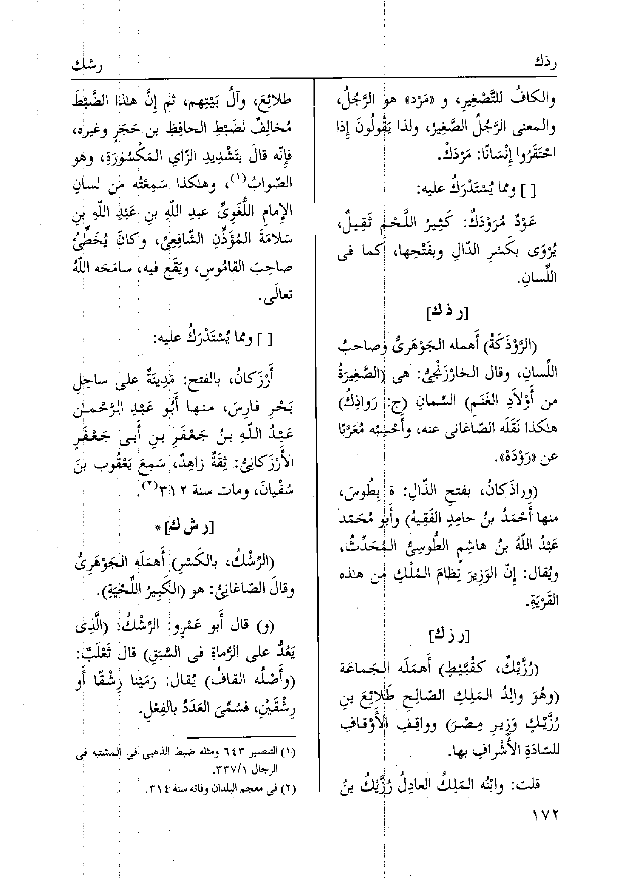 الرَّوْذَكَةُ أَهمله الْجَوْهَرِي وصاحبُ اللِّسانِ، وَقَالَ الخارْزَنْجيُ: هِيَ الصَّغِيرَةُ من أَوْلاَدِ الغَنَمِ السِّمانِ رَواذِكُ هَكَذَا نَقَلَه الصّاغاني عَنهُ، وأحْسِبه مُعَرَبًا عَن رَوْدَه. وراذَكانُ، بفتحِ الذّالِ: بِطُوسَ، مِنْهَا أَحْمَدُ بنُ حامِدٍ الفَقِيهُ وأَبو مُحَمّد عبد اللهُ بنُ هاشِم الطُّوسيُّ المُحَدِّثُ، ويُقال: إِنّ الوَزِيرَ نِظامَ المُلْكِ من هَذِه القَريَة.