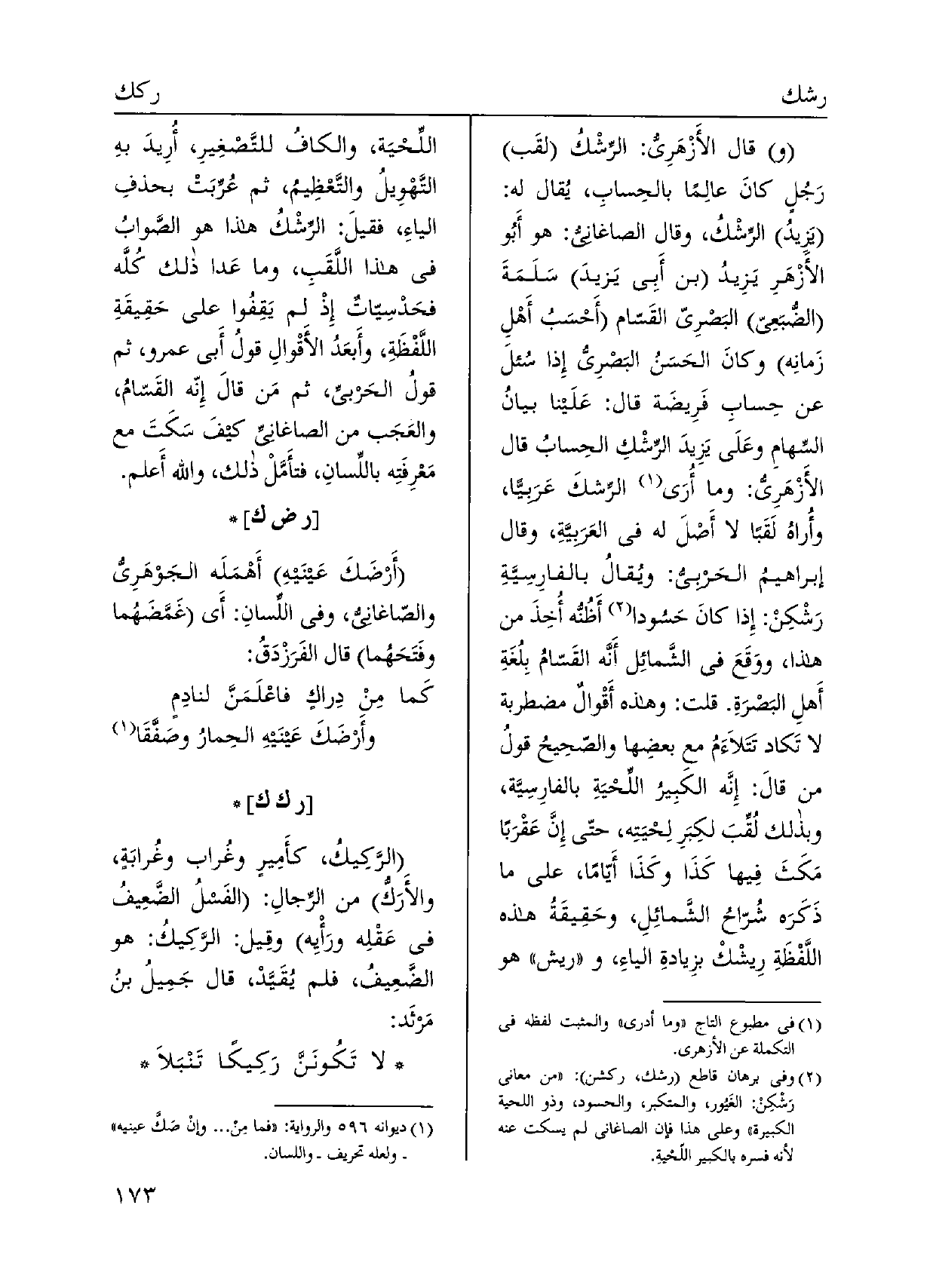 وَقَالَ الْأَزْهَرِي: الرِّشْكُ القَب رَجُلٍ كانَ عالِمًا بالحِسابِ، يُقال لَهُ: يَزِيدُ الرِّشْكُ، وَقَالَ الصاغانيُ: هُوَ أَبُو الأَزْهَرِ يزِيدُ بن أبي يَزيدَ سَلَمَةَ الضُّبَعِي البَصْرِيّ القَسّام أَحْسَبُ أَهْلِ زَمانِه وكانَ الحَسَنُ البَصْرِيُّ إِذا سُئلَ عَن حِسابِ فَرِيضَة قَالَ: عَلَينا بيانُ السِّهام وعَلَى يَزِيدَ الرِّشكِ الحِسابُ قَالَ الْأَزْهَرِي: وَمَا أُرَى الرِّشكَ عَرَبيًّا، وأُراهُ لَقبًا لَا أَصْلَ لَهُ فِي العَرَبيَّةِ، وَقَالَ إبراهيمُ الحَربيُّ: ويُقالُ بالفارِسِيَّةِ رَشْكِنْ: إِذا كانَ حَسُودا أَظُنُّه أُخِذَ من هَذَا، ووَقَعَ فِي الشَّمائِل أَنَّه القَسّامُ بِلُغَةِ أَهلِ البَصْرَةِ. قلت: وَهَذِه أَقْوال مضطربة لَا تَكاد تَتَلاَءَمُ مَعَ بعضِها والصّحِيحُ قولُ من قالَ: إِنَّه الكَبِيرُ اللِّحْيَةِ بالفارِسِيَّة، وَبِذَلِك لُقِّبَ لكِبَرِ لِحْيَتِه، حتىّ إِنَّ عَقْرَبًا مَكَثَ فِيها كَذَا وكَذَا أَيّامًا، على مَا ذَكَرَه شُرّاحُ الشَّمائِلِ، وحَقِيقَةُ هَذِه اللَّفْظَةِ رِيشْكْ بزِيادةِ الياءِ، وَرِيش هُوَ اللِّحْيَة، وَالْكَاف للتَّصْغِيرِ، أُرِيدَ بهِ التَّهْوِيلُ والتَّعْظِيمُ، ثمَّ عُرِّبَتْ بحذفِ الياءِ، فقيلَ: الرِّشْكُ هَذَا هُوَ الصَّوابُ فِي هَذَا اللَّقَبِ، وَمَا عَدا ذَلِك كُلَّه فحَدْسِيّاتٌ إِذ لم يَقِفُوا على حَقِيقَةِ اللَّفْظَةِ، وأَبعَدُ الأَقْوالِ قولُ أبي عَمْرو، ثمَّ قولُ الحَربي، ثمَّ مَن قالَ إِنّه القَسّامُ، والعَجَب من الصاغانيِّ كيفَ سَكَتَ مَعَ مَعْرِفَتِه باللِّسانِ، فتأَمَّلْ ذَلِك، وَالله أَعلم.)