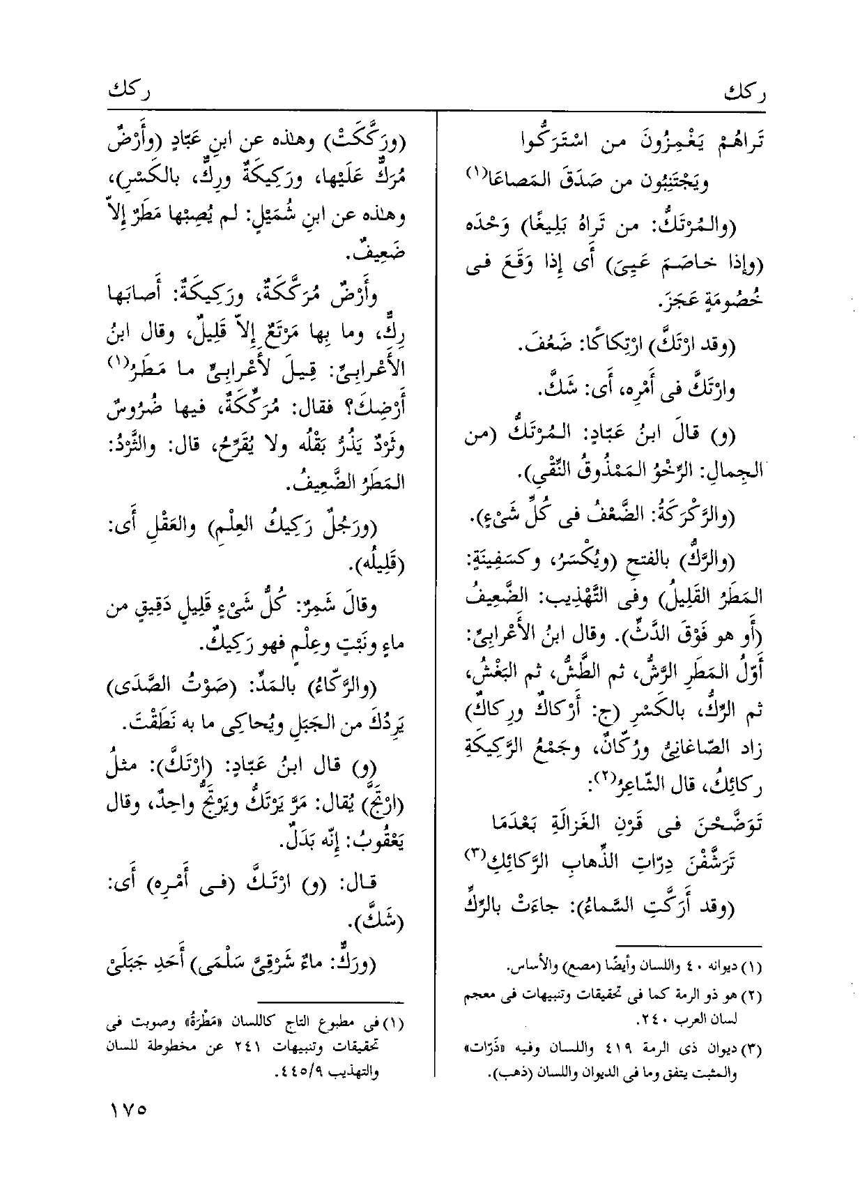 {وارْتَكَّ فِي أَمْرِه، أَي: شَكَّ. وقالَ ابنُ عَبّادٍ: المُرتَكُّ من الجِمالِ: الرِّخْوُ المَمْذُوقُ النِّقْيِ.} والرَّكْرَكَةُ: الضَّعْفُ فِي كُلِّ شَيءٍ. {والرَكُّ بالفتحِ ويُكْسَرُ، وكسَفِينَةٍ: المَطَرُ القَلِيلُ وَفِي التَّهْذِيب: الضَّعِيفُ أَو هُوَ فَوْقَ الدَّثِّ. وَقَالَ ابنُ الأَعْرابِي: أَوّلُ المَطَرِ الرَّشُّ، ثمَّ الطَّش، ثمَّ البَغْشُ، ثمَّ الركُّ، بالكَسرِ} أَرْكاكٌ {ورِكاكٌ زَاد الصّاغانيُ} ورُكّانٌ، وجَمعُ {الرَكِيكَةِ} ركائِكُ، قَالَ الشّاعِرُ: