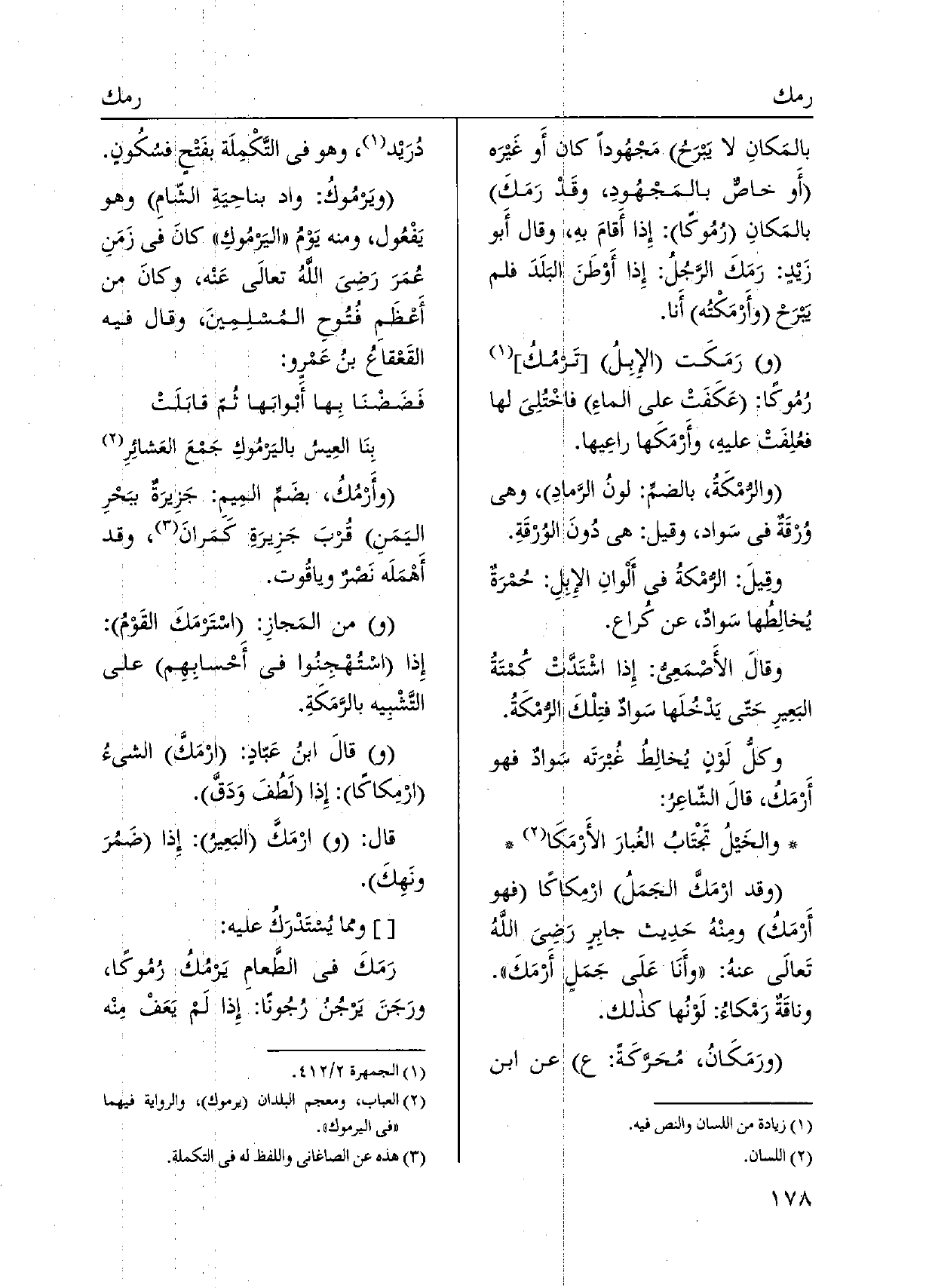 ورَمَكَت الإِبِلُ تَرمُكُ، رُمُوكًا: عَكَفَتْ على الماءِ فاخْتلِيَ لَهَا فعُلِفَتْ عليهِ، وأَرْمَكَها راعِيها. والرُّمْكَةُ، بالضمِّ: لونُ الرَّمادِ، وَهِي وُرقَةٌ فِي سَواد، وَقيل: هِيَ دُونَ الوُرْقَةِ. وقِيلَ: الرُّمْكةُ فِي أَلْوانِ الإِبِلِ: حُفرَةٌ يُخالِطُها سَوادٌ، عَن كُراع. وقالَ الأَصْمَعِي: إِذا اشْتَدَّتْ كُمْتَةُ البَعِيرِ حَتّى يَدْخلَها سَوادٌ فتِلْكَ الرّمْكَةُ. وكلُّ لَوْنٍ يُخالِطُ غُيرَتَه سَوادٌ فَهُوَ أَرْمَكُ، قالَ الشّاعِرُ: والخيلُ تَجْتَابُ الغُبارَ الأَرْمَكَا وَقد ارْمَكَّ الجَمَلُ ارْمِكاكًا فَهُوَ أَرْمَكُ ومِنْهُ حَدِيث جابِرٍ رَضِي اللَّهُ تَعالَى عنهُ: وأَنَا عَلَى جَمَلٍ أَرْمَكَ. وناقَةٌ رَمْكاءُ:) لَوْنُها كَذَلِك. ورَمَكَانُ، مُحَرَّكَةً: عَن ابْن دُرَيْد، وَهُوَ فِي التَّكمِلَة بفَتْحٍ فسُكونٍ. ويَرمُوكُ: وَاد بناحِيَةِ الشّامِ وَهُوَ يَفْعُول، وَمِنْه يَوْمُ اليَرمُوكِ كانَ فِي زَمَنِ عُمَرَ رَضِي اللَّه تعالَى عَنْه، وكانَ من أَعْظَمِ فُتُوحِ المُسلِمِينَ، وَقَالَ فِيهِ القَعْقاعُ بنُ عَمْرو: