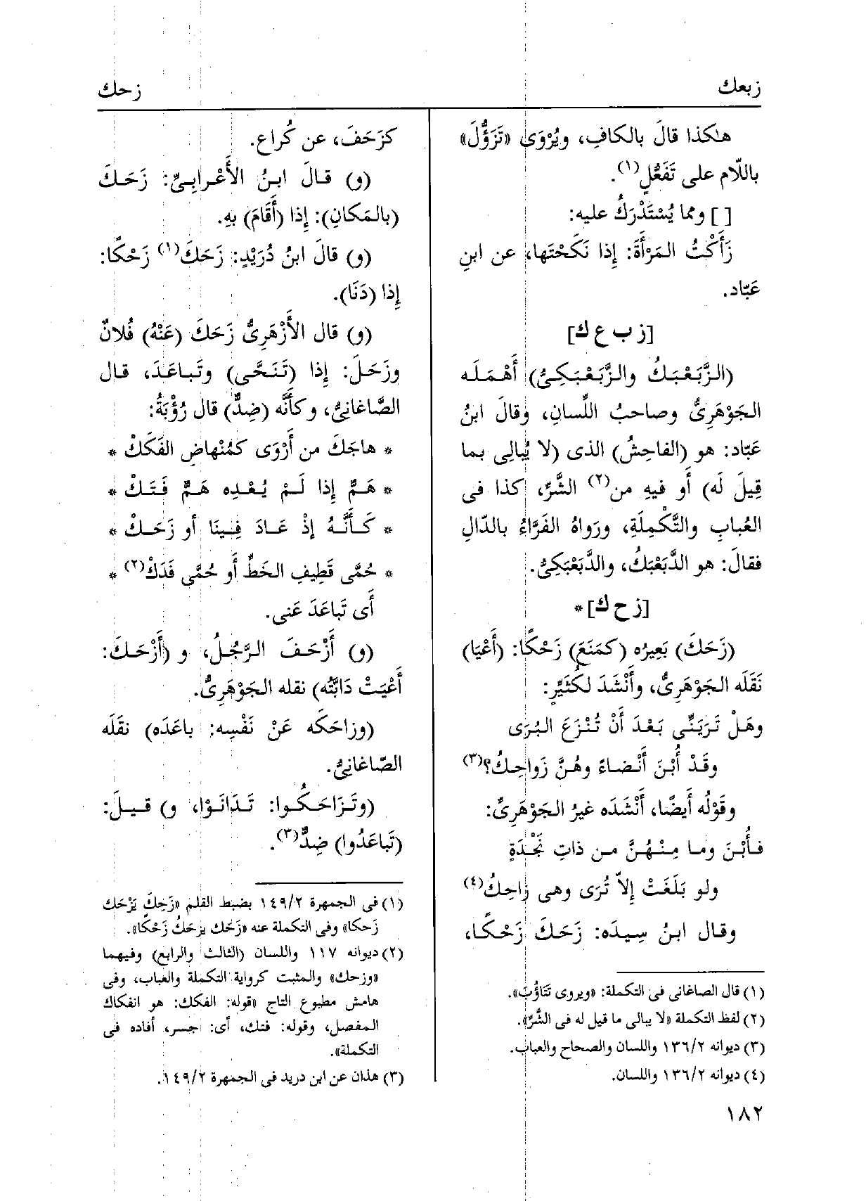 وَقَالَ ابنُ سِيدَه: زَحَكَ زَحْكًا، كزَحَفَ، عَن كُراع. وقالَ ابنُ الأَعْرابِي: زَحَكَ بالمَكانِ: إِذا أَقَامَ بهِ. وقالَ ابنُ دُرَيْدٍ: زَحَكَ زَحْكًا: إِذا دَنَا. وَقَالَ الْأَزْهَرِي زَحَكَ عَنْهُ فُلانٌ وزَحَلَ: إِذا تَنَحَّى وتَباعَدَ، قَالَ الصَّاغانيُ، وكأَنَّه ضِدٌّ قَالَ رُؤْبَةُ: هاجَكَ من أَرْوَى كمُنْهاضِ الفَكَكْ هَمٌّ إِذا لَمْ يُعْدِه هَمٌّ فَتَكْ كَأَنَّهُ إذْ عَادَ فِينَا أَو زَحَكْ حُمَّى قَطِيفِ الخَطّ أَو حُمَّى فَدَكْ أَي تَباعَدَ عَني. وأَزْحَفَ الرَجُلُ، وأَزْحَكَ: أَعْيَتْ دَابّته نَقله الْجَوْهَرِي. وزاحَكَه عَنْ نَفْسِه: باعَدَه نقَلَه الصّاغانيُ.