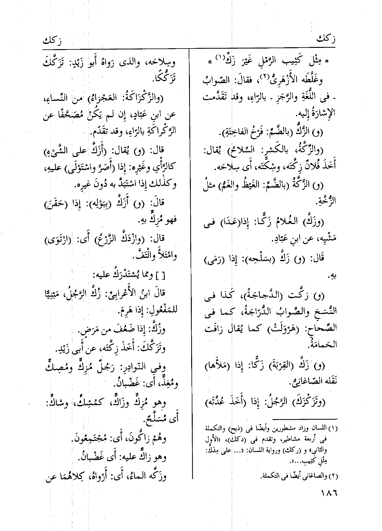 وَمِمَّا يسْتَدرك عَلَيْهِ: قالَ ابنُ الأَعْرابِي:} زُكَّ الرَّجُلُ، مَبنِيًّا للمَفْعُولِ: إِذا هَرِمَ. {وزُكَ: إِذا ضَعُفَ من مَرَضٍ.} وتَزَكَّكَ: أَخَذَ {زِكَّتَه، عَن أبي زَيْدٍ. وَفِي النّوادِرِ: رَجُلٌ} مُزِكٌّ ومُصِكٌّ ومُغِذّ، أَي: غَضْبانُ. وَهُوَ {مُزِكٌّ} وزَاكٌّ، كمُشِك، وشاك: أَي مُسَلَّحٌ. وهُمْ {زاكُّونَ، أَي: مُجْتَمِعُونَ. وَهُوَ} زاكٌّ عَلَيْهِ: أَي غَضْبانُ.! وزَكَّه الماءُ، أَي: أَرْواهُ، كِلاهُمَا عَن