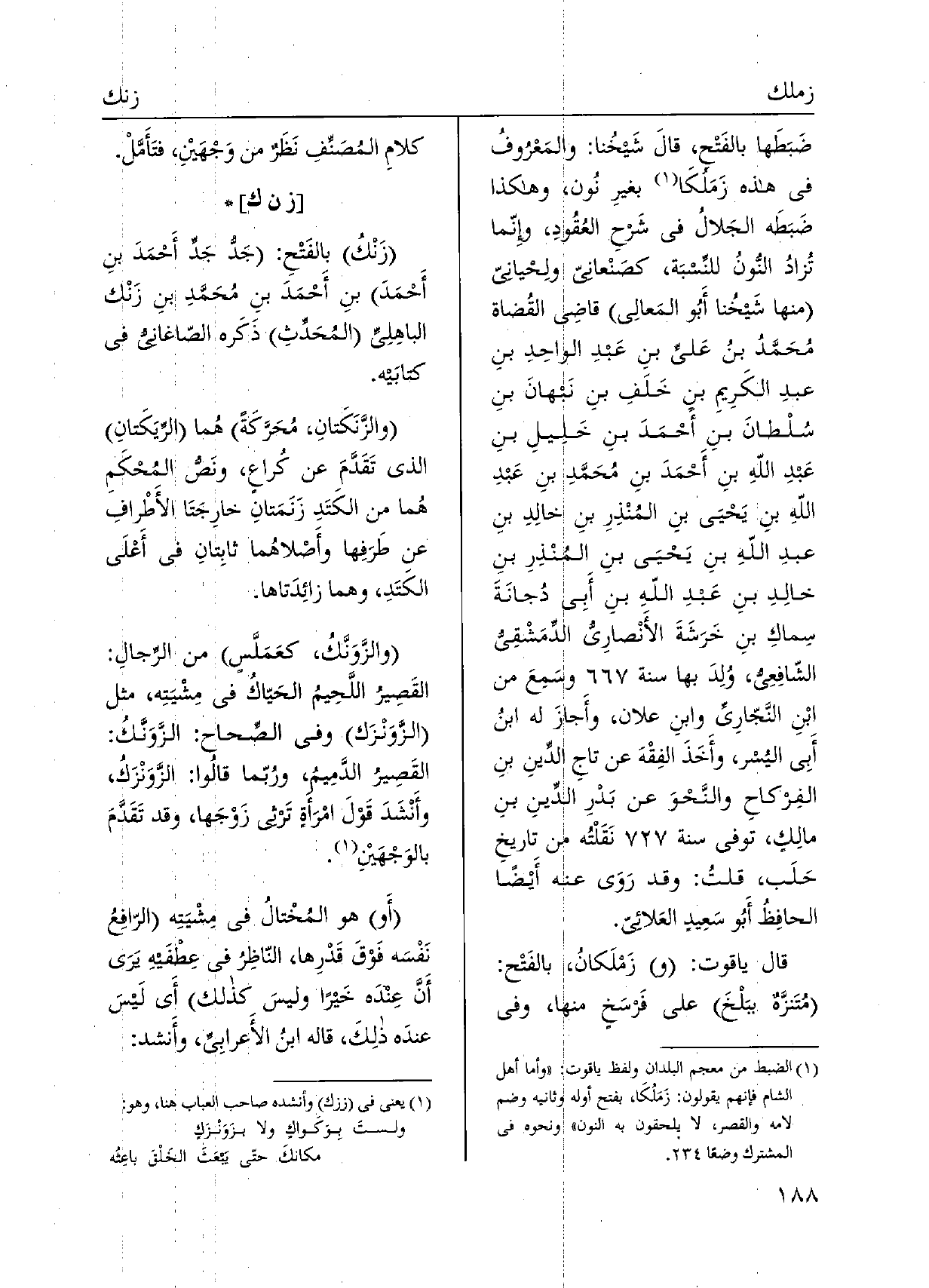 ضَبَطَها بالفَتْح، قالَ شَيخُنا: والمَعْرُوفُ فِي هَذِه زَمَلُكَا بغيرِ نُون، وَهَكَذَا ضَبَطَه الجَلالُ فِي شَرحِ العُقُودِ، وإِنّما تُزادُ النُّونُ للنِّشبَة، كصَنْعانِي ولِحْياني مِنْهَا شَيخنا أَبُو المَعالِي قاضِي القُضاة مُحَمَّدُ بنُ عَليِّ بنِ عَبدِ الواحِدِ بنِ عبدِ الكَرِيمِ بنِ خَلَفِ بنِ نبهانَ بنِ سُلْطانَ بنِ أَحْمَدَ بنِ خَلِيلِ بنِ عَبدِ اللهِ بنِ أَحْمَدَ بنِ مُحَمَّدِ بنِ عَبدِ اللهِ بنِ يَحْيَى بنِ المُنْذِرِ بنِ خالِدِ بنِ عبدِ اللهِ بنِ يَحْيَى بنِ المنْذِرِ بنِ خالِدِ بنِ عَبدِ اللهِ بنِ أبي دُجانَةَ سِماكِ بنِ خَرَشَةَ الأَنْصارِيُّ الدِّمَشْقِيُ الشّافِعِيُّ، وُلِدَ بهَا سنة وسَمِعَ من ابْنِ النَّجّارِيِّ وابنِ عَلان، وأَجازَ لَهُ ابنُ أبي اليُسر، وأَخَذَ الفِقْهَ عَن تاجِ الدِّينِ بنِ الفِركاحِ والنَّحْوَ عَن بَدْرِ الدِّينِ بنِ مالِكٍ، توفّي سنة نَقَلْتُه من تاريخِ حَلَب، قلتُ: وَقد رَوَى عَنهُ أَيْضًا الحافِظُ أَبُو سَعِيدٍ العَلائي. قَالَ ياقوت: وزَمْلَكانُ، بالفَتْح: مُتَنزَّهٌ ببَلْخَ على فَرسَخٍ مِنْهَا، وَفِي كلامِ المُصَنِّفِ نَظَرٌ من وَجْهَيْنِ، فتَأَمَّلْ.