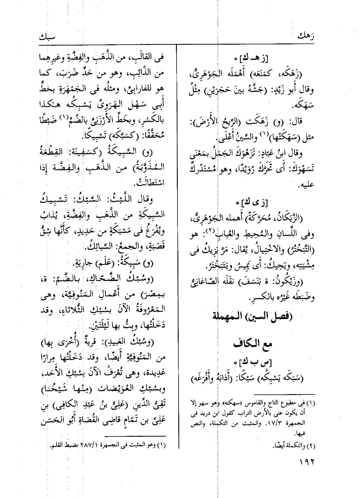 زَهَكَه، كمَنَعَه أَهْمَلَه الْجَوْهَرِي، وَقَالَ أَبو زَيْدٍ: جَشَّهُ بينَ حَجَرَيْنِ مِثْلُ سَهَكَه. قَالَ: وزَهَكَت الرِّيحُ الأَرْضَ: مثل سَهَكَتْها والسِّينُ أَعْلَى. وَقَالَ ابنُ عَبّادٍ: تَزَهْوَكَ الجَمَلُ بمَعْنَى تَسَهْوَكَ: أَي تَحَرَكَ رُوَيْداً، وَهُوَ مُستَدْركٌ عَلَيْهِ.