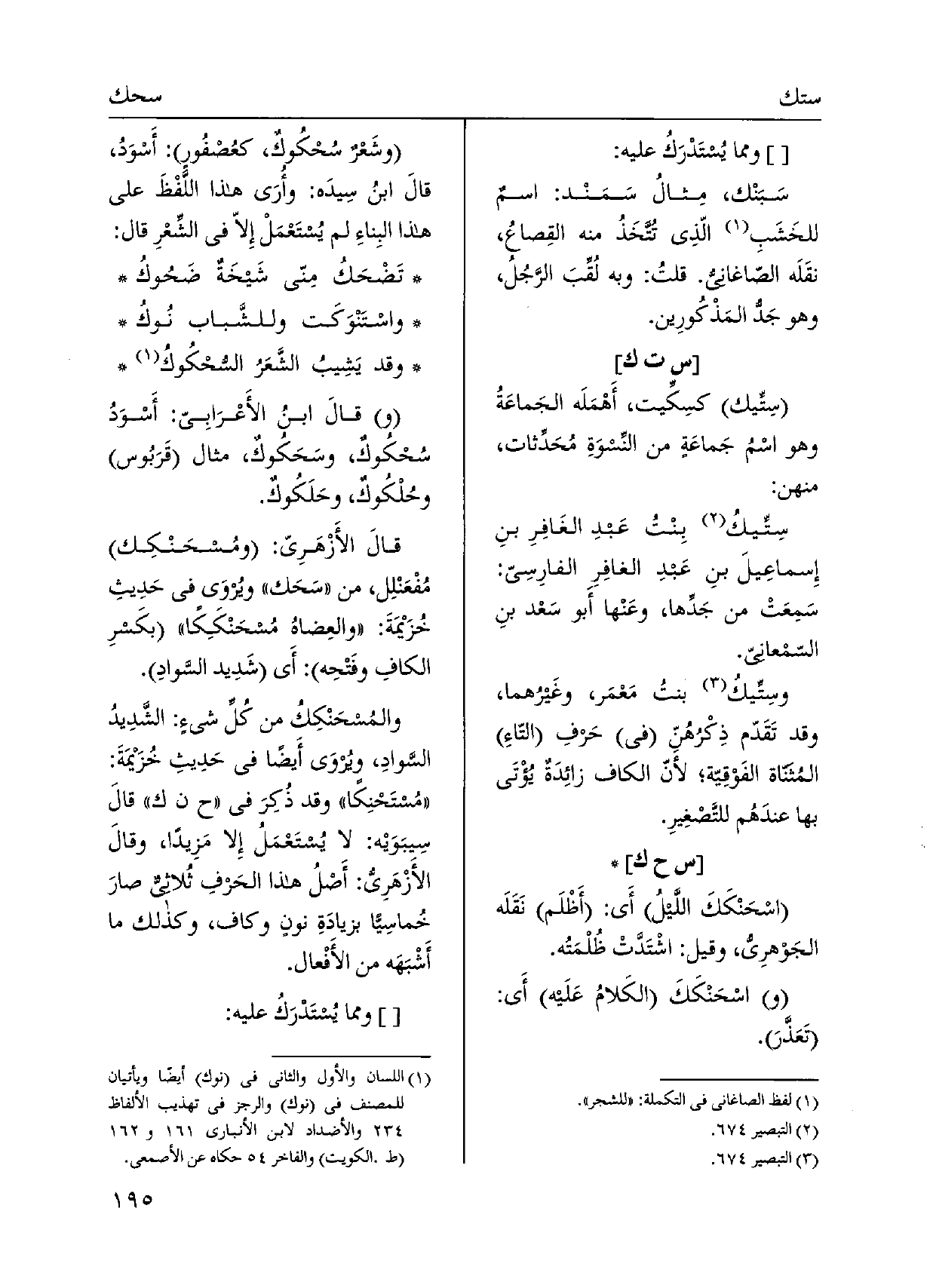اسْحَنْكَكَ اللّيل أَي: أَظْلَم نَقَلَه الْجَوْهَرِي، وَقيل: اشْتَدَّتْ ظُلْمَتُه. واسْحَنْكَكَ الكَلامُ عَلَيه أَي: تَعَذرَ. وشَعْرٌ سُحْكُوكٌ، كعُصْفُور: أسْوَدُ، قالَ ابنُ سِيدَه: وأُرَى هَذَا اللَّفْظَ على هَذَا البِناءِ لم يستَعْمَلْ إِلاّ فِي الشِّعْر قَالَ: تَضْحَكُ مِنّي شَيخَةٌ ضَحُوكُ واسْتَنْوَكَت وللشَّباب نُوكَُ وَقد يَشِيبُ الشَّعَرُ السُّحْكُوكُ وقالَ ابنُ الأَعْرَابي: أَسْوَدُ سُحْكُوكٌ، وسَحَكُوكٌ، مِثَال قَرَبُوس وحلكُوكٌ، وحَلَكُوكٌ. قالَ الْأَزْهَرِي: ومُسحَنْكِك مُفْعَنْلِل، من سَحَك ويُروَى فِي حَدِيثِ خُزيمَةَ: والعِضاهُ مسحَنْككاً بكسرِ الكافِ وفَتْحِه: أَي شَدِيد السَّوادِ.