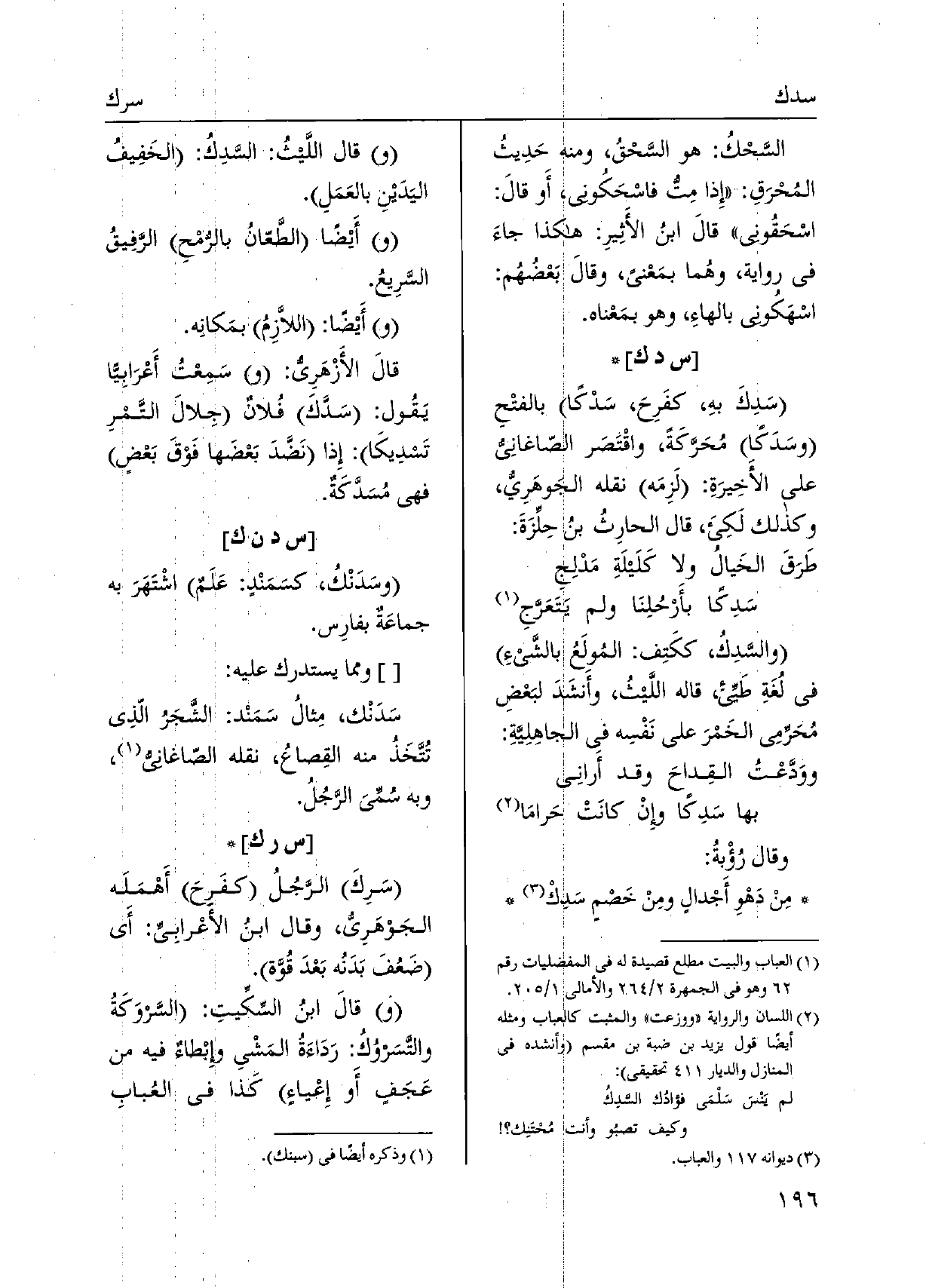 وَقَالَ رؤْبةُ: مِنْ دَهْو أَجْدالٍ ومِنْ خَصْمٍ سَدِكْ وَقَالَ الليثُ: السَّدِكُ: الخَفِيفُ اليَدَيْنِ بالعَمَلِ. وأَيْضاً الطَّعّانُ بالرُّمْحِ الرَّفِيقُ السَّرِيع. وأَيْضاً: اللاَّزِمُ بمَكانِه. قالَ الْأَزْهَرِي: وسَمعت أَعْرَابِيًّاً يَقُول: سَدَّكَ فُلانٌ جِلالَ التَّمْرِ تَسدِيكاً: إِذا نَضَّدَ بَعْضَها فَوْقَ بَعْض فَهِيَ مُسَدَّكَة.