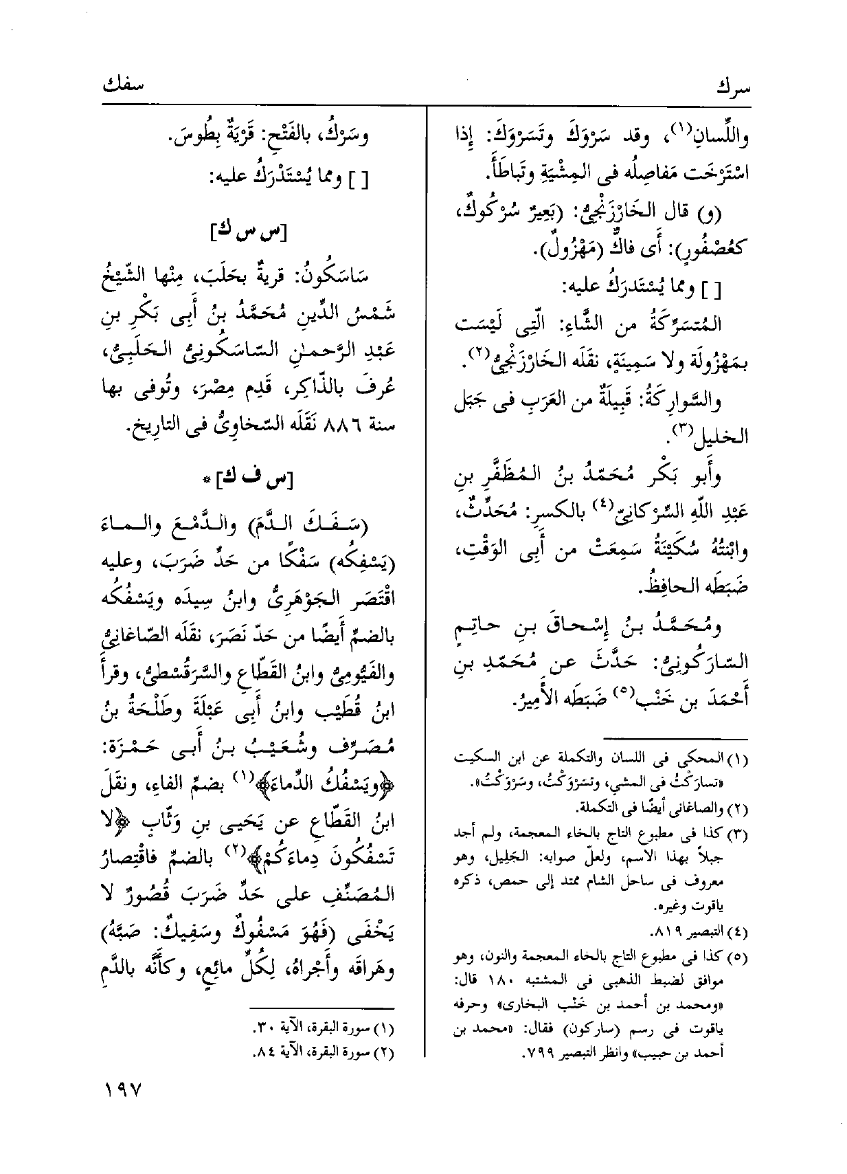 {سَاسَكُونُ: قريةٌ بحَلَبَ، مِنْها الشّيخ شَمْسُ الدِّينِ مُحَمَّدُ بنُ أبي بَكْرِ بنِ عَبدِ الرَّحمن} - السّاسَكُونِي الحَلَبِيُ، عُرفَ بالذّاكِر، قَدِم مِصْرَ، وتُوفي بهَا سنة نَقَلَه السّخاوِيُّ فِي التارِيخ.