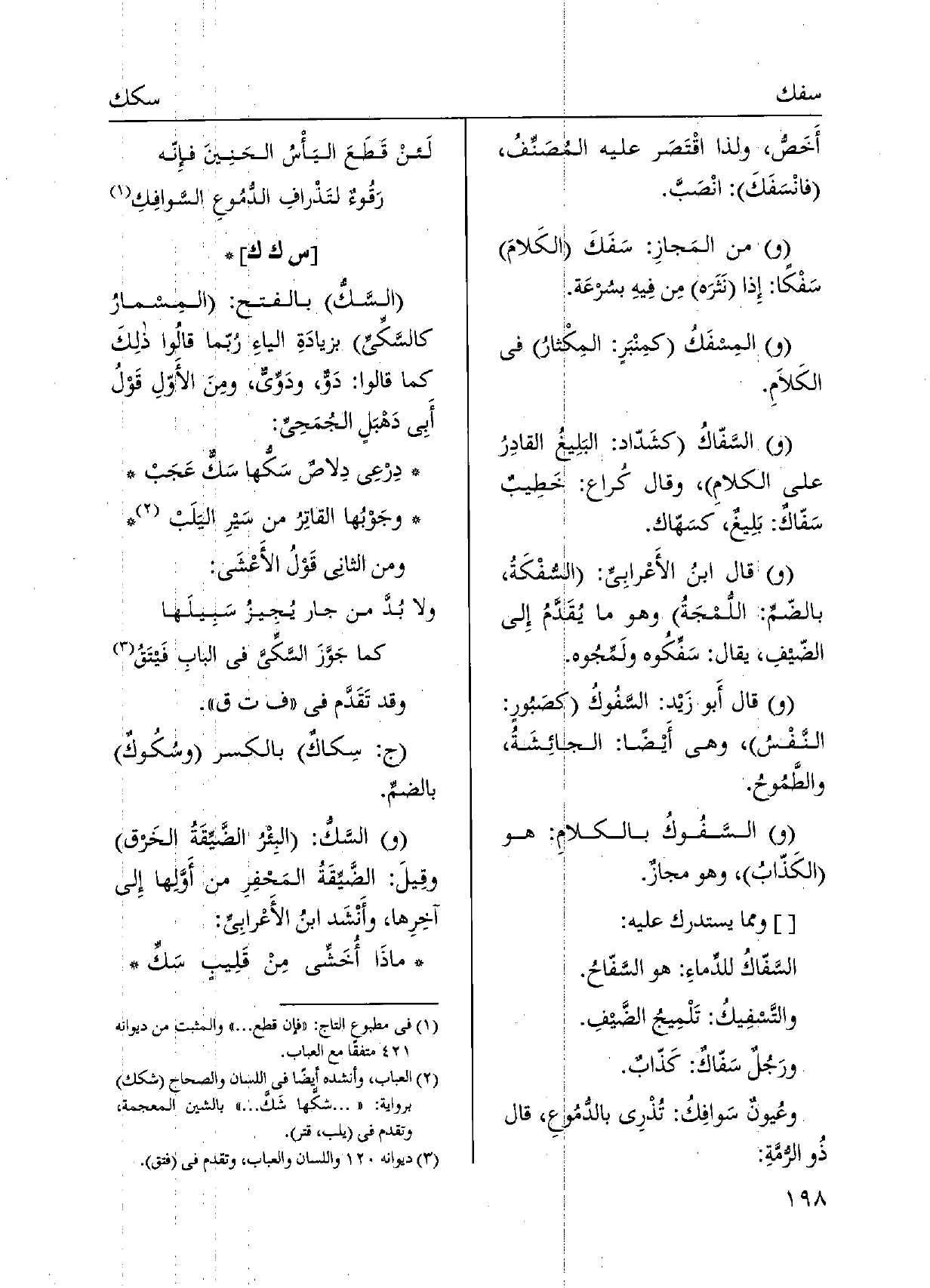 وَمِمَّا يسْتَدرك عَلَيْهِ: السَّفّاكُ للدِّماءِ: هُوَ السَّفّاحُ. والتّسفِيكُ: تَلْمِيجُ الضَّيفِ. ورَجُلٌ سَفّاكٌ: كَذّابٌ. وعُيونٌ سَوافِكُ: تُذْرِي بالدُّمُوعِ، قَالَ ذُو الرمَةِ:)