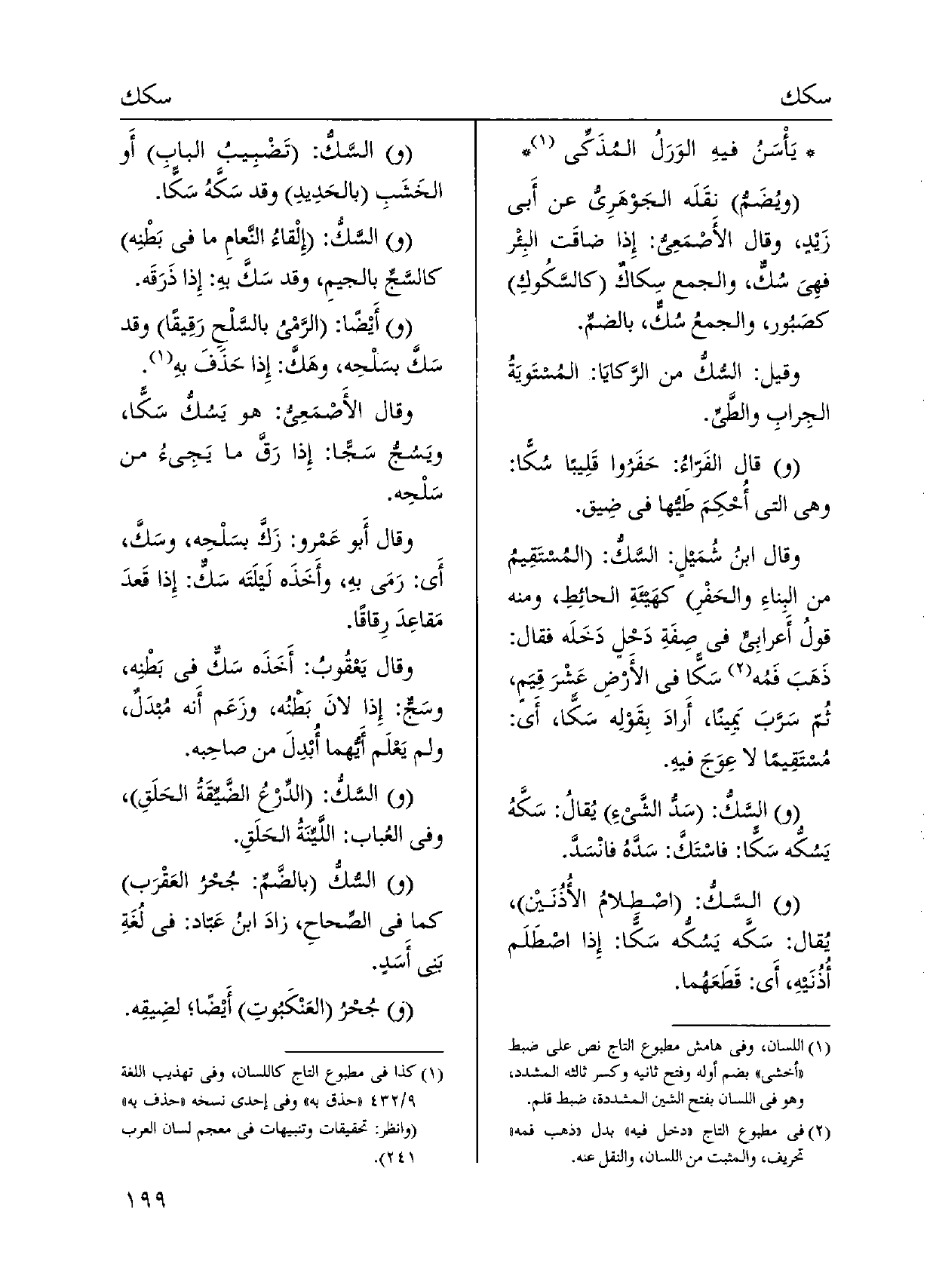 يَأْسَنُ فيهِ الوَرَلُ المُذَكِّي ويُضَمُّ نقَلَه الْجَوْهَرِي عَن أبي زَيْدٍ، وَقَالَ الأَصْمَعِيُّ: إِذا ضاقَت البِئْر فَهِيَ {سُكٌّ، وَالْجمع سِكاكٌ} كالسَّكُوكِ كصَبُور، وَالْجمع سُكٌّ، بالضمِّ. وَقيل: {السّكُّ من الرَّكايَا: المُستَويَةُ الجِرابِ والطيّ. وَقَالَ الفَرّاءُ: حَفَرُوا قَلِيبًا} سُكًّا: وَهِي الَّتِي أحْكِمَ طَيُّها فِي ضِيق. وَقَالَ ابنُ شُمَيل: السَّكُّ: المُستَقِيمُ من البِناءِ والحَفْرِ كهَيئَةِ الحائِطِ، وَمِنْه قولُ أَعرابِي فِي صِفَةِ دَحْلٍ دَخَلَه فَقَالَ: ذَهَبَ فَمُه سَكًّا فِي الأَرْضِ عَشْرَ قِيَم، ثُمّ سَرَّبَ يَمِينًا، أَرادَ بِقَوْلِه {سَكًّا، أَي: مُستَقِيمًا لَا عِوَجَ فيهِ. والسَّكُّ: سَدُّ الشّيءِ يُقالُ: سَكَّهُ يَسُكُّه سَكًّا: فاسْتَكَّ: سَدَّهُ فانْسَدَّ. والسَّكُّ: اصْطِلامُ الأُذُنَيْن، يُقَال:} سَكَّه {يَسُكّه سَكًّا: إِذا اصْطَلَم أذُنَيهِ، أَي: قَطَعَهُما. والسَّكّ: تَصبِيبُ البابِ أَو الخَشَبِ بالحَدِيدِ وَقد} سَكَّهُ سَكًّا. والسَّكّ: إِلْقاءُ النَّعامِ مَا فِي بَطْنِه كالسَّجِّ بالجيمِ، وَقد {سَكَّ بهِ: إِذا ذَرَقَه. وأَيْضًا: الرَّمْي بالسَّلْحِ رَقِيقًا وَقد سَكَّ بسَلْحِه، وهَكَّ: إِذا حَذَفَ بهِ. وَقَالَ الأَصْمَعِيُ: هُوَ} يَسُكُّ سَكًّا، ويَسُجُّ سَجًّا: إِذا رَقَّ مَا يَجيءُ من سَلْحِه. وَقَالَ أَبو عَمْرو: زَكَّ بسَلْحِه،! وسَكَّ، أَي: رَمَى بهِ، وأَخَذَه لَيلَتَه سَكٌّ: إِذا قَعدَ مَقاعِدَ رِقاقًا. وَقَالَ يَعْقُوبُ: أَخَذَه سَكٌّ فِي بَطْنِه، وسَجٌّ: إِذا لانَ بَطْنُه، وزَعَم أَنه مُبدَلٌ، وَلم يَعْلَم أَيُّهما أبْدِلَ من صاحِبه. والسَّكُّ: الدِّرْعُ الضَّيِّقَةُ الحَلَقِ، وَفِي العُباب: اللَّيِّنَةُ الحَلَقِ. والسّكُّ بالضَّمِّ: جُحْرُ العَقْرَب كَمَا فِي الصِّحاحِ، زادَ ابنُ عَبّاد: فِي لُغَةِ بني أَسَد. وجُحْرُ العَنْكَبُوتِ أَيْضًا لضِيقِه.