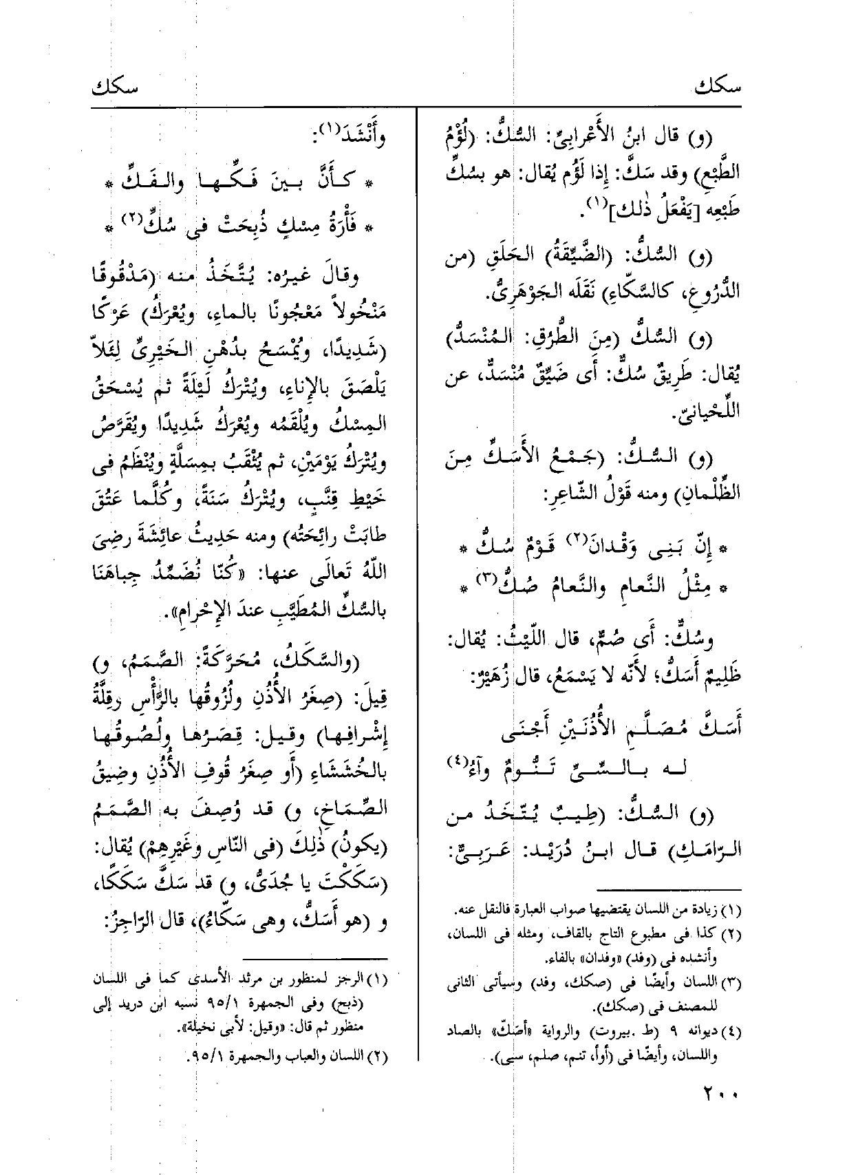 والسُّكُّ: طِيبٌ يُتّخَدُ من الرّامَكِ قَالَ ابنُ دُرَيْد: عَرَبيٌ: وأَنْشَدَ: كأَنَّ بينَ فَكِّها والفَكِّ فَأْرَةُ مِسْكٍ ذُبِحَت فِي سُكِّ وقالَ غيرُه: يُتَّخَذُ مِنْهُ مَدْقُوقًا مَنْخُولاً مَعْجُونًا بالماءِ، ويُعْرَكُ عَركًا شَدِيدًا، وُيمْسَحُ بدُهْنِ الخَيرِيِّ لِئَلاّ يَلْصَقَ الإِناءِ، ويُتْرَكُ لَيلَةً ثمَّ يُسحَقُ المِسكُ ويُلْقَمُه ويُعْرَكُ شَدِيدًا ويُقَرَص ويُتْرَك يَوْمَيْنِ، ثمَّ يُثْقَبُ بمِسَلَّةٍ ويُنْظَمُ فِي خَيطِ قِنَّبٍ، ويتْرَكُ سَنَةً، وكُلَّما عَتُقَ طابَتْ رائِحَتُه وَمِنْه حَدِيثُ عائِشَةَ رَضِي اللهُ تَعالَى عَنْهَا: كُنّا نُضَمِّدُ جِباهَنَا} بالسُّكِّ لمُطَيَّبِ عندَ الإِحْرامِ. {والسَّكَكُ، مُحَرَّكَةً: الصَّمَمُ، وقِيلَ: صِغَرُ الأذُنِ ولُزُوقُها بالرَّأْسِ وقِلَّةُ إِشْرافِها وَقيل: قِصَرُها ولُصُوقُها بالخُشَشَاءِ أَو صِغَرُ قُوفِ الأُذُنِ وضِيقُ الصِّمَاخِ، وَقد وُصِفَ بِهِ الصَّمَمُ يكونُ ذلِكَ فِي النّاسِ وغَيرِهِمْ يُقال: سَكَكْتَ يَا جُدَيّ، وَقد سَكَّ} سَكَكًا، وَهُوَ أَسَكُّ، وَهِي سَكّاءُ، قَالَ الرّاجِزُ: