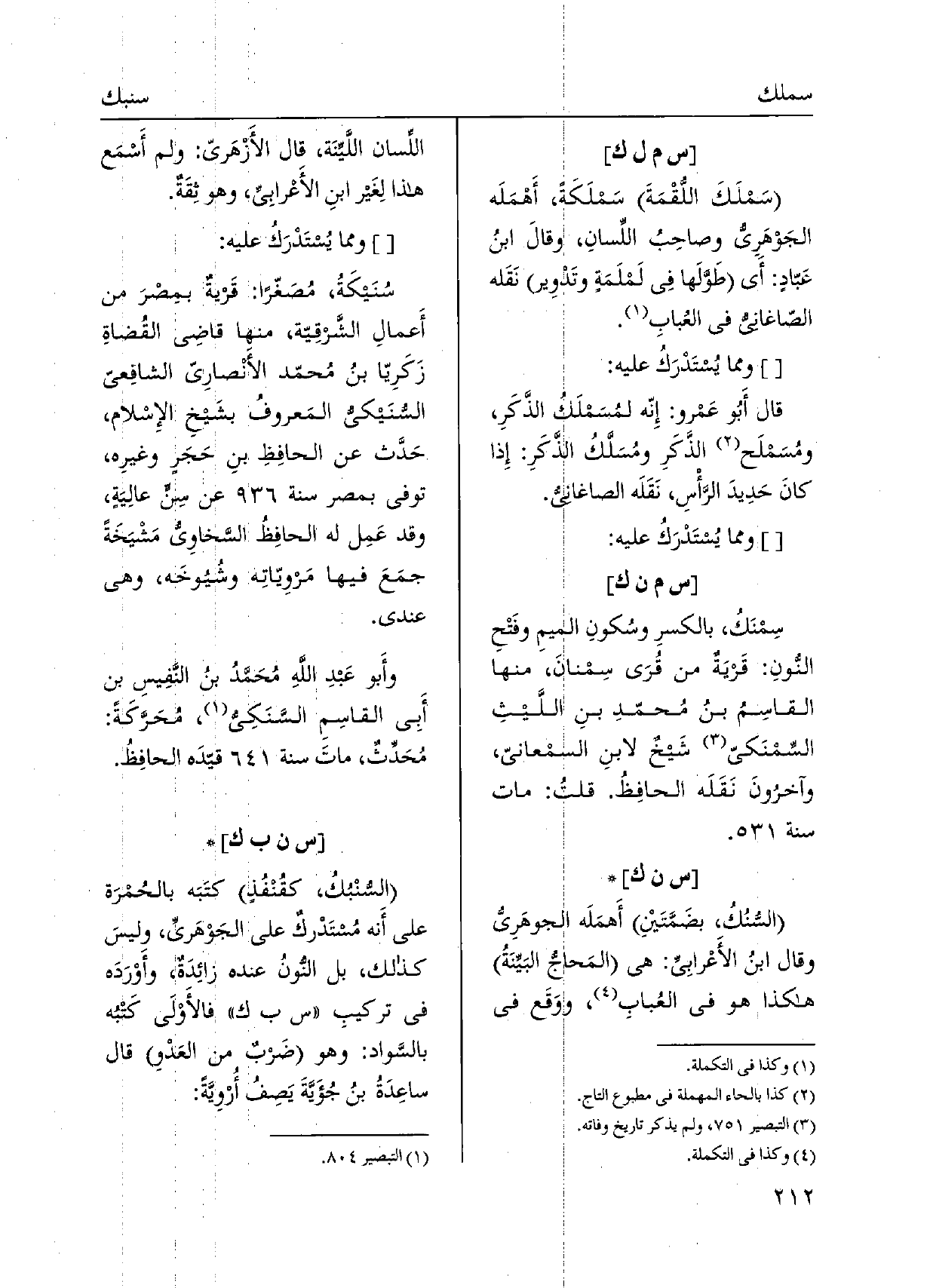 وَمِمَّا يسْتَدرك عَلَيْهِ: سنيكَةُ، مُصَغّراً: قَريةٌ بمِصْرَ من أَعمالِ الشّرقِيّة، مِنْهَا قاضِي القُضاةِ زَكَرِيّا بنُ مُحمّد الأَنْصارِيّ الشافِعي السُّنيكيُ المَعروفُ بشَيخ الإِسْلام، حَدَّث عَن الحافِظِ بنِ حَجَرٍ وغيرِه، توفّي بِمصْر سنة عَن سِن عالِيَةٍ، وَقد عَمِل لَهُ الحافِظُ السَّخاويّ مَشْيَخَةً جمَعَ فِيهَا مَروِيّاتِه وشُيُوخَه، وَهِي عِنْدِي. وأَبو عَبدِ اللَّهِ مُحَمّدَ بنُ النَّفِيسِ بن أبي القاسِمِ السَّنَكِيُّ، مُحَرَّكَةً: مُحَدِّثٌ، ماتَ سنة قيّدَه الحافِظُ.