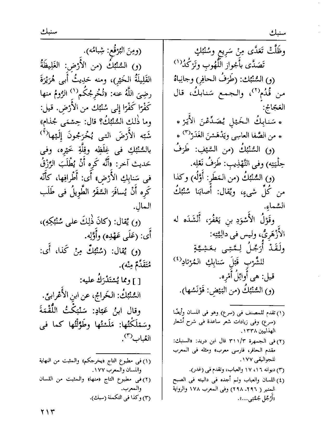 والسُّنْبُك: طَرَفُ الحافِرِ وجانِباهُ من قدُمٍ، وَالْجمع سَنابكُ، قَالَ العَجّاج: سَنابِكُ الخَيلِ يُصَدِّعْنَ الأَيَر من الصَّفا العاسِي ويَدْهَشنَ الغَدَرْ والسُّنْبُكُ من السَّيفِ: طَرَفُ حِلْيَتِه وَفِي التَّهْذِيبِ: طَرَفُ نَعْلِه. والسُّنْبُكُ من المَطَرِ: أَوَّله وَكَذَا من كُلِّ شَيْء، ويُقال: أَصابَنا سُنْبُكُ السَّماءِ. وقولُ الأَسْوَدِ بنِ يَعْفُرَ، أَنْشَدَه لَهُ الأَزْهَرِيُّ، وَلَيْسَ فِي دالِيَّتِه: