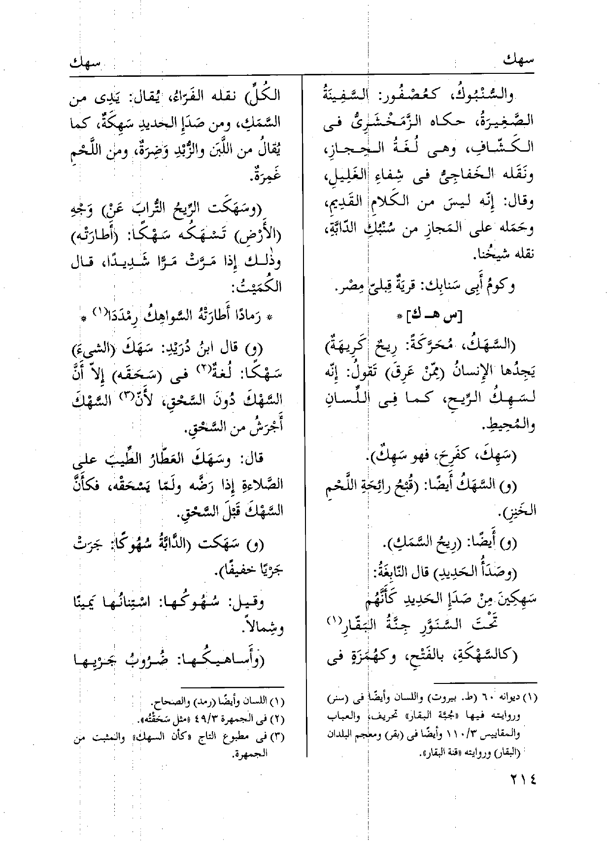 كالسَّهْكَةِ، بالفَتْحِ، وكهُمَزَةٍ فِي الكُلِّ نَقله الفَرّاءُ، يُقال: يَدِي من السَّمَكِ، وَمن صَدَإِ الحديدِ سَهِكَةٌ، كَمَا يُقالُ من اللَّبَن والزُّبْدِ وَضِرَةٌ، وَمن اللَّحْمِ غَمِرَةٌ. وسَهَكَت الرِّيحُ التّرابَ عَنْ وَجْهِ الأَرْضِ تَسهَكُه سَهْكًا: أَطارَتْه وَذَلِكَ إِذا مَرَّتْ مَرًّا شَدِيدًا، قَالَ الكُمَيتُ: رَمادًا أَطارَتْهُ السَّواهِكُ رِمْدَدَا وَقَالَ ابنُ دُرَيْدِ: سَهَكَ الشَّيْء سَهْكًا: لُغةٌ فِي سَحَقَه إِلاّ أَنَّ السَّهْكَ دُونَ السَّحْقِ، لأَنّ السَّهْكَ أَجْرَشُ من السَّحْقِ.