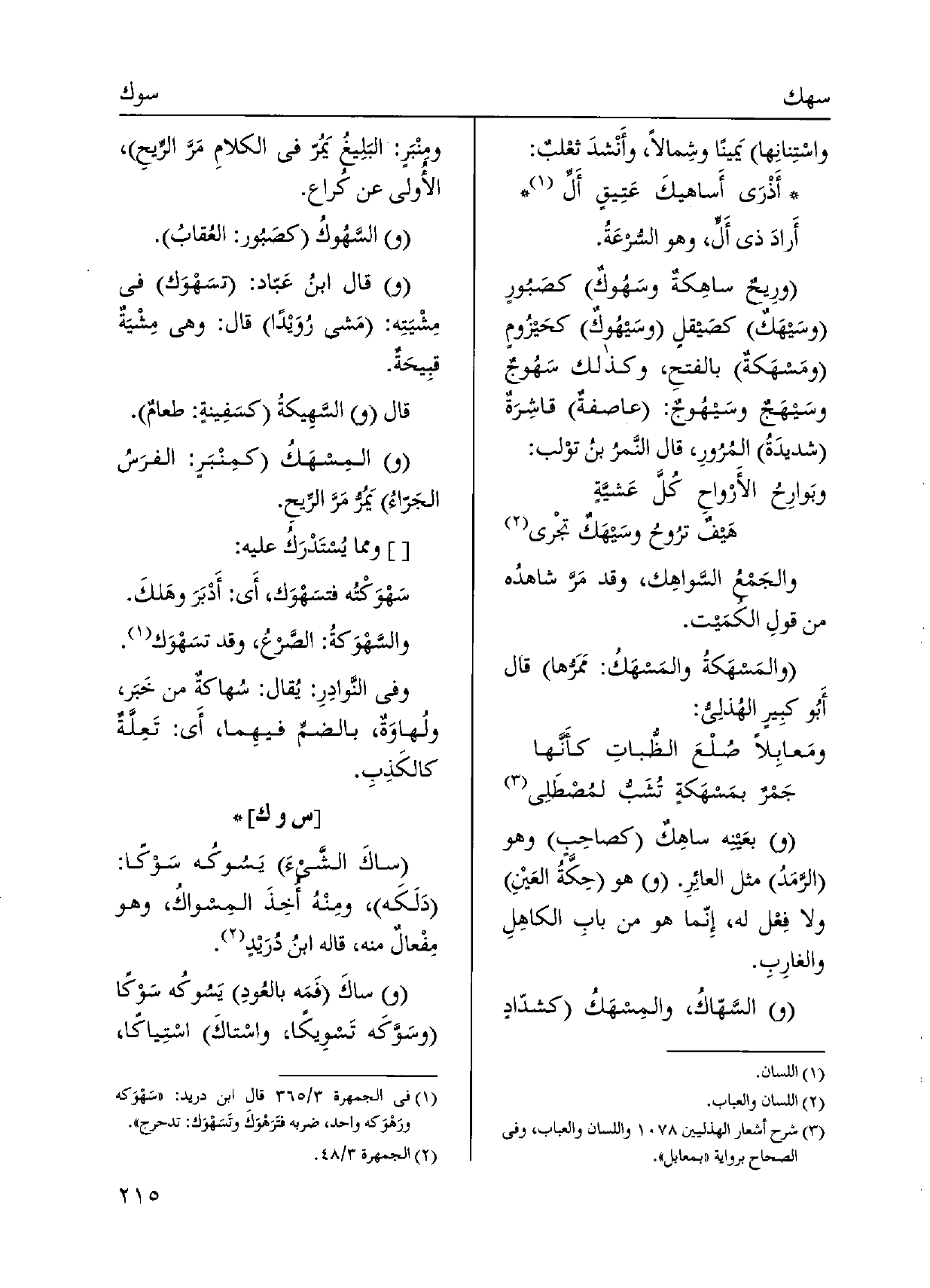 واسْتِنانِها يَمينًا وشِمالاً، وأَنْشدَ ثعْلبٌ: أَذْرَى أَساهيكَ عَتِيقٍ أَلِّ أَراد ذِي أَلِّ، وَهُوَ السُّرعَةُ. ورِيحٌ ساهِكةٌ وسَهوكٌ كصَبُورٍ وسَيهَكٌ كصَيقلٍ وسَيهُوكٌ كحَيزُوم ومَسهَكةٌ بالفتحِ، وَكَذَلِكَ سَهُوجٌ وسَيهَجٌ وسيهُوجٌ: عاصفةٌ قاشِرَةٌ شديدَةُ المُرُورِ، قَالَ النَّمرُ بنُ توْلب:
