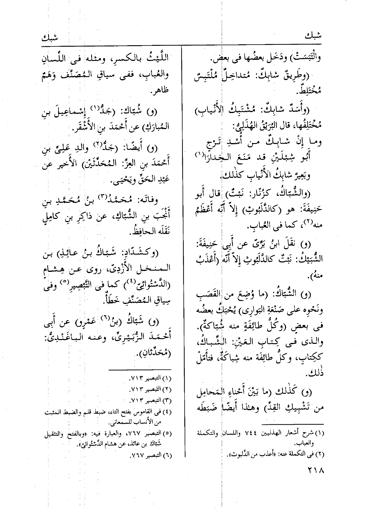والشُّبّاكُ، كزُنّار: نَبتٌ قَالَ أَبو حَنِيفَةَ: هُوَ كالدَّلَبُوثِ إِلاّ أَنّه أَعْظَمُ مِنْهُ، كَمَا فِي العُبابِ. ونقَلَ ابنُ بَريّ عَن أبي حَنِيفَةَ: الشّبَيكُ: نَبتٌ كالدَّلَبُوثِ إِلاّ أَنّه أَعْذَبُ منهُ. والشُّبّاكُ: مَا وُضِعَ من القَصَبِ ونَحْوِه على صَنْعَةِ البَوارِي يُحْبَكُ بعضُه فِي بعضٍ وكُلُّ طائِفَةٍ مِنْهُ شُبّاكةٌ. وَالَّذِي فِي كِتابِ العَين: الشِّباكُ، ككِتابٍ، وكلُّ طائِفَة مِنْهُ شِباكَةٌ، فتأَمّلْ ذَلِك. وكَذلك مَا بَيْنَ أَحْناءِ المَحامِل من تَشْبِيكِ القِدِّ وَهَذَا أَيضًا ضَبَطَه اللَّيثُ بالكسرِ، وَمثله فِي اللِّسانِ والعُبابِ، فَفِي سياقِ المُصَنِّف وَهَمٌ ظَاهر. وشُبّاك: جَدُّ إِسْماعِيلَ بنِ المُبارَكِ عَن أَحْمَدَ بنِ الأَشْقَر. وأَيضًا: جَدُّ والدِ عَلِي بنِ أَحْمَدَ بنِ العِزِّ: المُحَدِّثَينْ الأَخير عَن عَبدِ الحَقِّ ويَحْيَى. وفاتَه: مُحَمَّدُ بنُ مُحَمَّدِ بنِ أَنْجَبَ بنِ الشُّبّاكِ، عَن ذاكِرِ بنِ كامِلٍ نَقَلَه الحافِظ. وكشَدّادٍ: شَبّاكُ بنُ عائِذِ بن المنخل الأَزْدِيّ، روى عَن هِشامٍ الدَّسْتُوائي كَمَا فِي التَّبصِيرِ وَفِي سِياقِ المُصَنِّفِ خَطَأٌ. وشَبّاكُ بنُ عَمْرو عَن أبي أَحْمَدَ الزبَيرِيِّ، وَعنهُ الباغَنْدِيُّ: مُحَدِّثانِ.