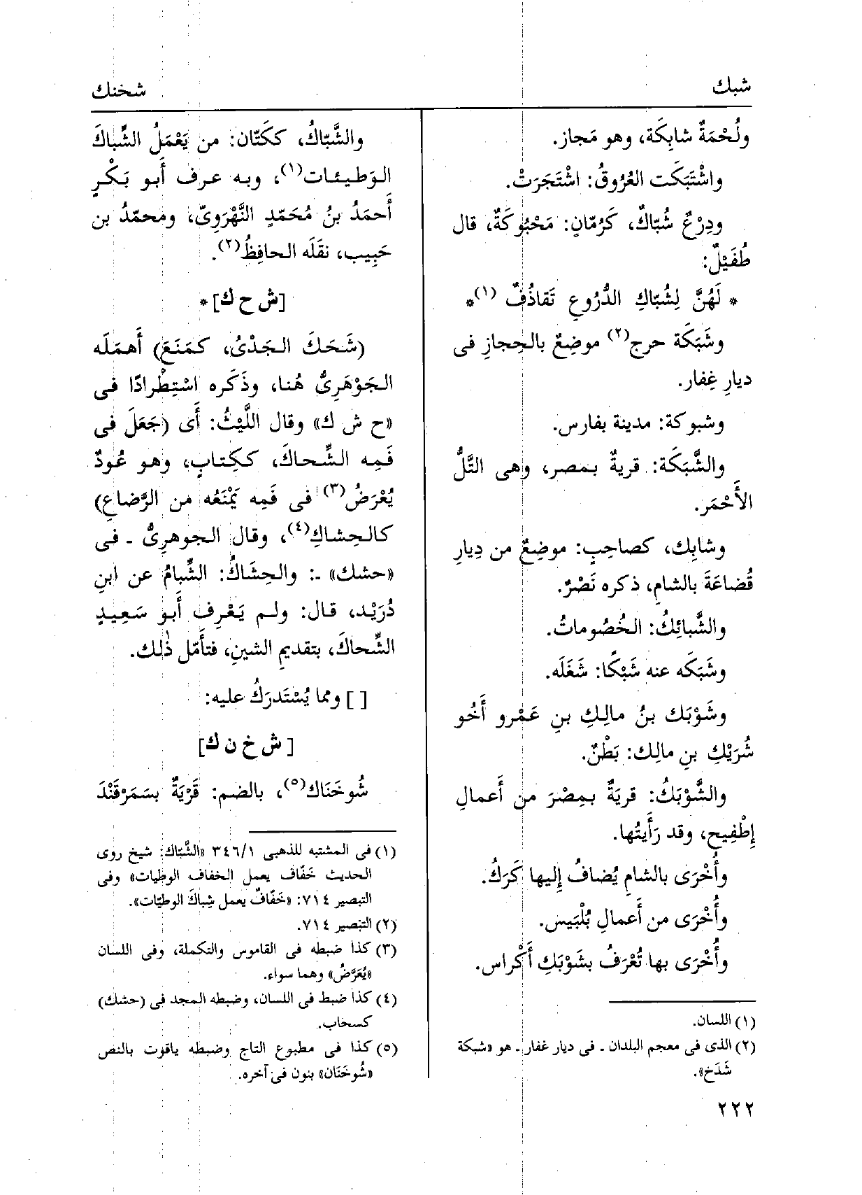 ولُحْمَةٌ شابِكَة، وَهُوَ مَجاز. واشْتَبَكَت العُرُوقُ: اشْتَجَرَتْ. ودِرْعٌ شُبّاكٌ، كَرُمّانٍ: مَحْبُوكَةٌ، قَالَ طُفَيل: لَهُنَّ لِشُبّاكِ الدُّرُوعِ تَقاذُفٌ وشَبَكَة حرج موضِعٌ بالحِجازِ فِي ديارِ غِفار. وشبوكة: مَدِينَة بِفَارِس. والشَّبَكَة: قريةٌ بِمصْر، وَهِي التَّلُّ الأَحْمَر.