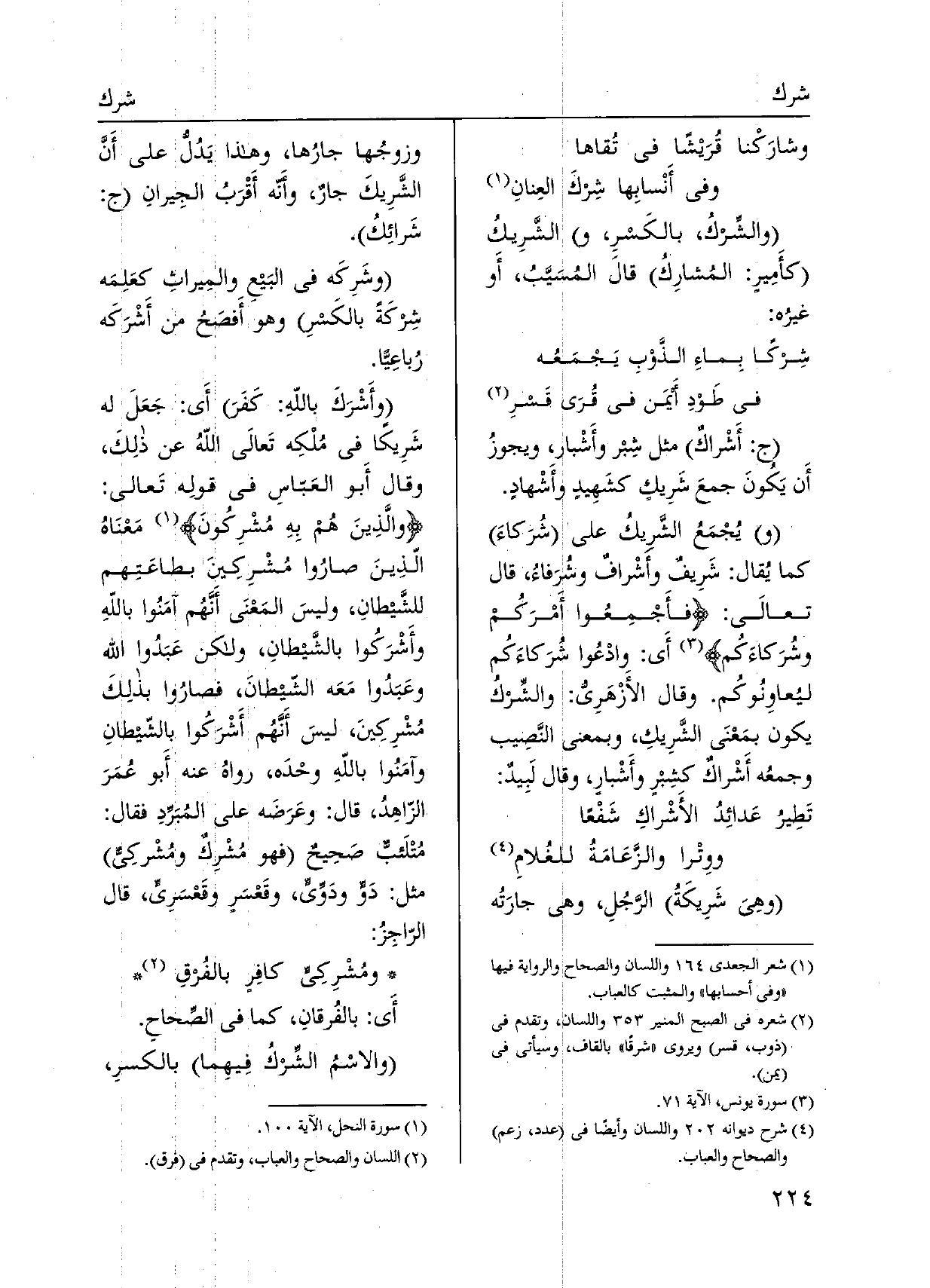 وشَرِكَه فِي البَيعِ والمِيراثِ كعَلِمَه شِركَةً بالكَسرِ وَهُوَ أَفصَحُ من أَشْرَكَه رُباعِيًّا. وأَشْرَكَ باللهِ: كَفَرَ أَي: جَعَلَ لَهُ شَرِيكًا فِي مُلْكِه تَعالَى اللهُ عَن ذلِكَ، وَقَالَ أَبو العَبّاسِ فِي قولِه تَعالى: والَّذِينَ هُم بِهِ مُشْرِكونَ مَعْنَاهُ الّذِينَ صارُوا مُشْرِكِينَ بطاعَتِهم للشَّيطانِ، وليسَ المَعْنَى أَنَّهُم آمَنُوا باللهِ وأَشْرَكُوا بالشَّيطانِ، وَلَكِن عَبَدُوا الله وعَبَدُوا مَعَه الشّيطانَ، فصارُوا بذلِكَ مُشْرِكِينَ، ليسَ أَنَّهُم أَشْرَكُوا بالشّيطانِ وآمَنُوا باللهِ وحْدَه، رواهُ عَنهُ أَبو عُمَرَ الزّاهِدُ، قَالَ: وعَرَضَه على المُبَرِّدِ فَقَالَ: مُتْلَئبٌّ صَحِيحٌ فَهُوَ مُشْرِكٌ ومُشْركِيٌ مثل: دَو ودَوِّي، وقَعْسَرٍ وقَعْسَرِي، قَالَ الراجزُ: ومُشْرِكِي كافِرٍ بالفُرقِ أَي: بالفُرقانِ، كَمَا فِي الصِّحاحِ. والاسْمُ الشِّركُ فِيهِما بالكسرِ،