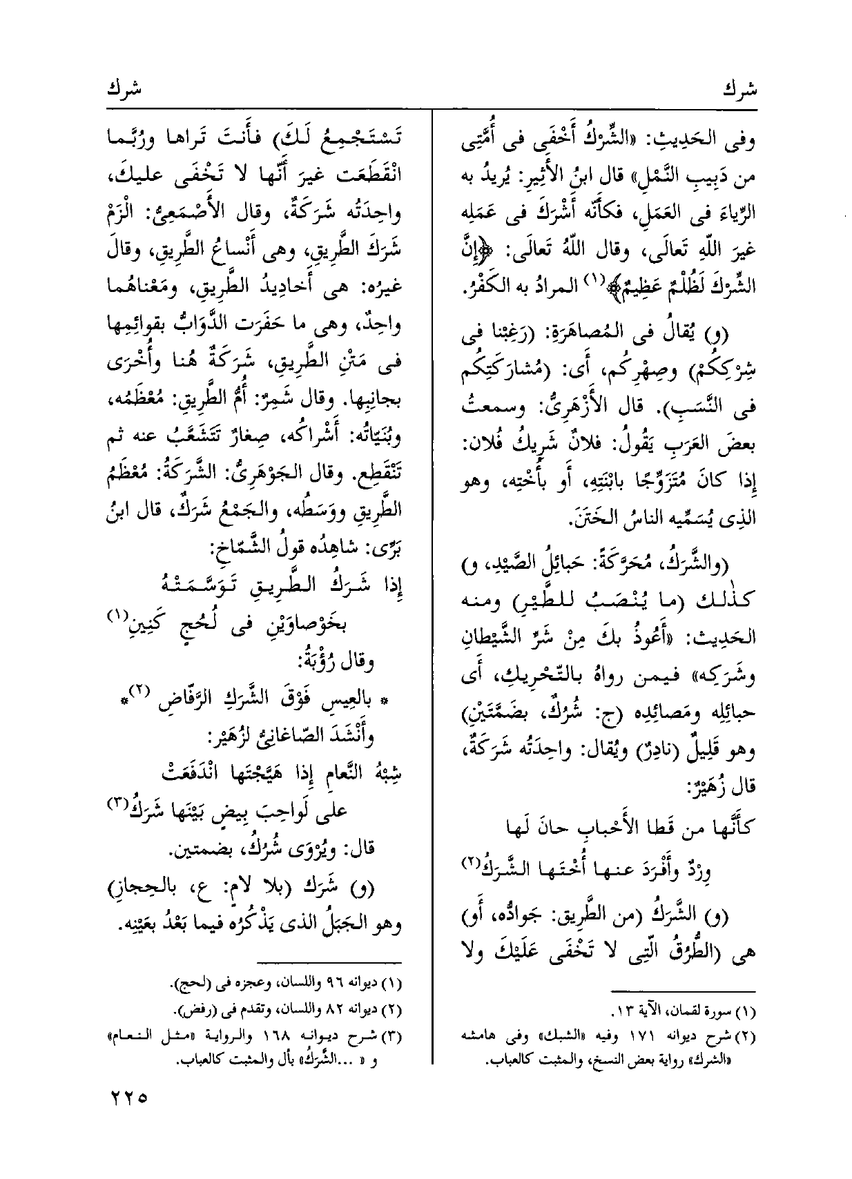 وَفِي الحَدِيثِ: الشِّركُ أَخْفى فِي أُمَّتِي من دَبِيبِ النَّمْلِ قَالَ ابنُ الأثِيرِ: يُريدُ بِهِ الرياءَ فِي العَمَلِ، فكأَنه أَشْرَكَ فِي عَمَلِه غيرَ اللهِ تَعالَى، وَقَالَ اللهُ تَعالَى: إنَّ الشِّركَ لَظُلْمٌ عَظِيمٌ المرادُ بِهِ الكَفْرُ. ويُقالُ فِي المُصاهَرَةِ: رَغِبنا فِي شِركِكُم وصِهْرِكُم، أَي: مُشارَكَتِكُم فِي النَّسَبِ. قَالَ)