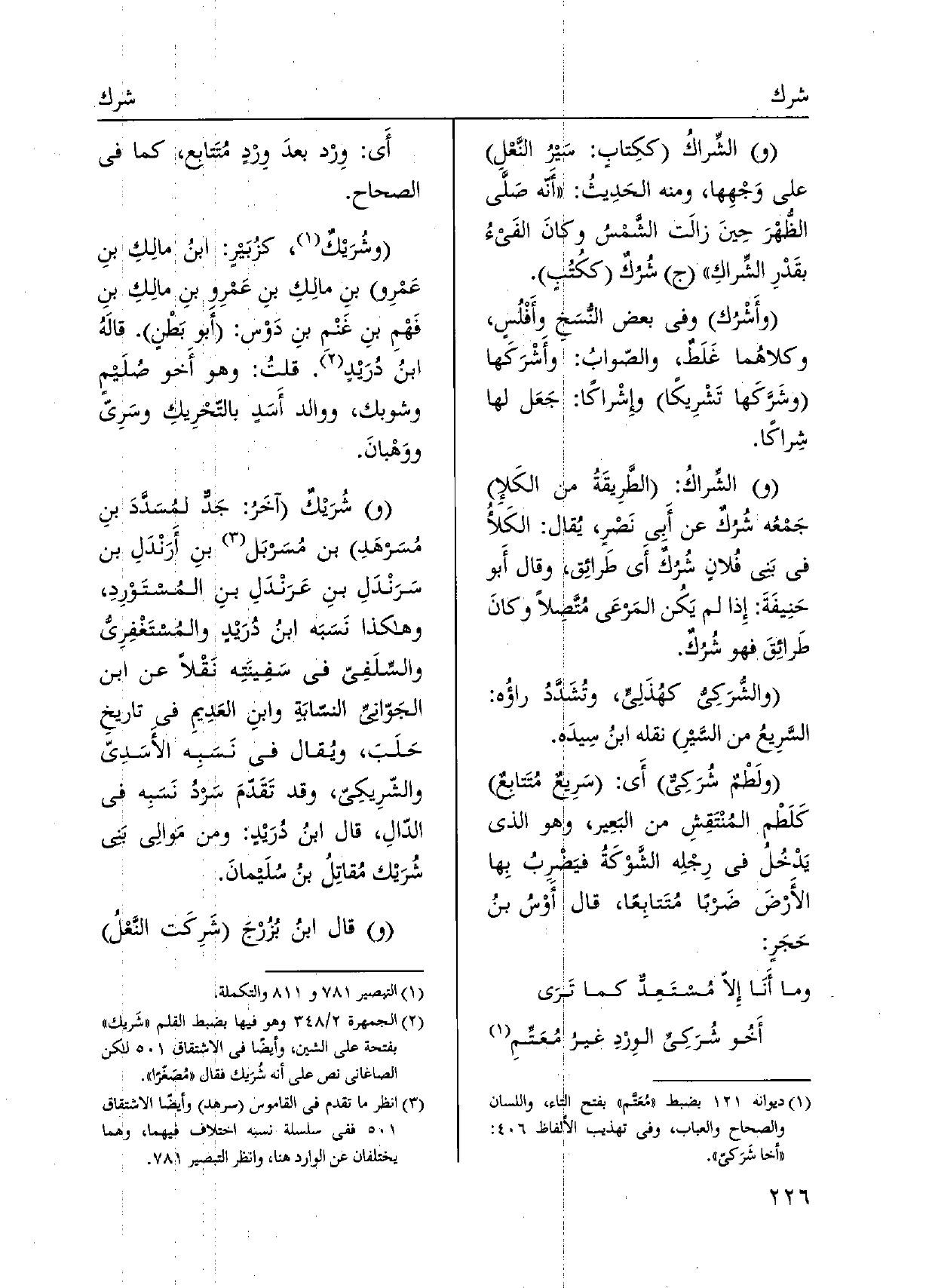 أَي: وِرد بعدَ وِرْدٍ مُتَتابع، كَمَا فِي الصِّحَاح. وشُرَيْكٌ، كزُبَيرٍ: ابنُ مالِكِ بنِ عَمْرِو بنِ مالِكِ بنِ عَمْرِو بنِ مالِكِ بنِ فَهْمِ بنِ غَنْم بنِ دَوْس: أَبو بَطْنٍ. قالَهُ ابنُ دُرَيْدٍ. قلتُ: وَهُوَ أَخو صُلَيمٍ وشوبك، ووالد أَسَدٍ بالتّحْرِيكِ وسَرِيّ)