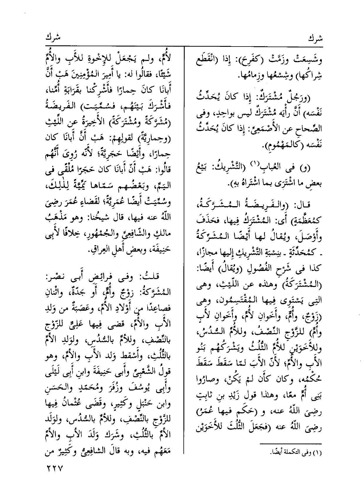 وشَسِعَتْ وزَمَّتْ كفَرِحَ: إِذا انْقَطَع شِراكُها وشِسعُها وزِمامُها. ورَجُلٌ مُشْتَرَكٌ: إِذا كانَ يُحَدِّثُ نَفْسَه أَنَّ رأيَه مُشْتَرَكٌ لَيْسَ بواحِدٍ، وَفِي الصِّحاحِ عَن الأَصْمَعِي: إِذا كانَ يُحَدِّث نَفْسَه كالمَهْمُومِ. وَفِي العُبابِ التَّشْرِيكُ: بَيعُ بعضِ مَا اشْتَرَى بِمَا اشْتَراهُ بهِ. قَالَ: والفَرِيضَةُ المُشَرَّكَة، كمُعَظَّمَةٍ أَي: المُشْتَرَكُ فِيها، فحَذَفَ وأَوْصَلَ، ويُقالُ لَهَا أَيْضًا المُشَرِّكَةُ كمُحَدِّثَةٍ بنِسبَةِ التَّشْرِيكِ إِليها مجَازًا، كَذَا فِي شَرحِ الفُصُولِ ويُقالُ أَيضًا: المُشْتَرَكَةُ وَهَذِه عَن اللّيثِ، وَهِي الَّتِي يَستَوِي فِيها المُقْتَسِمُون، وَهِي زوْج، وأُمٌ، وأَخَوانِ لأُم، وأَخَوانِ لأَبٍ وَأم للزَّوْج النِّصْفُ، وللأمِّ السُّدُسُ، وللأَخَوَين للأُمِّ الثُّلُثُ ويَشْرَكُهُم بَنُو الأبِ والأمِّ لأَنّ الأَبَ لمّا سَقَطَ سَقَطَ حُكْمُه، وَكَانَ كأَن لم يَكُنْ، وصارُوا بني أم مَعًا، وَهَذَا قَول زَيْدِ بنِ ثابِتٍ رَضِي اللهُ عَنهُ، وحَكَم فِيهَا عُمَرُ رَضِي اللهُ عَنهُ فجَعَلَ الثُّلُثَ للأَخَوَيْن لأم، وَلم يَجْعَلْ للإِخْوةِ للأَبِ والأمِّ شَيئًا، فقالُوا لَهُ: يَا أَمِيرَ المُؤْمِنِينَ هَبْ أَنَّ أَبانَا كانَ حِمارًا فأَشْرِكْنا بقَرَابَةِ أمِّنا، فأَشْرَكَ بَينَهُم، فسُمِّيَت الفَريضَةُ مُشَرَكَةً ومُشتَرَكَةً الأَخِيرَةُ عَن اللِّيثِ وحِمارِيَّةً لقولِهِم: هَبْ أَنَّ أَبانَا كَانَ حِمارًا، وأَيْضًا حَجَرِيَّةً لأَنه رُوِىَ أَنَّهُم قالُوا: هَبْ أَنّ أَبانَا كَانَ حَجَرًا مُلْقًى فِي اليَمِّ، وبَعْضُهم سَمّاها يَمِّيةً لِذلِكَ، وسُمِّيَتْ أَيضًا عُمَرِيَّةً لقَضاءِ عُمَرَ رَضِي اللهُ عَنهُ فِيهَا، قَالَ شيخُنا: وَهُوَ مَذْهَبُ مالكٍ والشّافِعِي والجُمهُورِ، خِلافًا لأبي حَنِيفَة، وبعضِ أَهلِ العِراقِ. قلتُ: وَفِي فرائِض أبي نصْر: المُشَرَّكةُ: زوْج وَأم أَو جَدّةٌ، واثْنانِ فصاعِدًا من أَوْلادِ الأمِّ، وعَصَبَةٌ من وَلدِ الأَبِ والأُمِّ، قضى فِيها عَلِيٌ للزّوْج بالنِّصْفِ، وللأمِّ بالسُّدُسِ، ولوَلدِ الأمِّ بالثّلُثِ، وأَسْقط وَلد الأَبِ والأمِّ، وَهُوَ قولُ الشَّعْبِي وَأبي حَنِيفَةَ وابنِ أبي لَيلَى وَأبي يُوسُفَ وزُفَرَ ومُحَمّدٍ والحَسَنِ وَابْن حَنْبَلٍ وكَثِيرٍ، وقَضَى عُثْمانُ فِيها للزَّوج بالنِّصْفِ، وللألم بالسّدُس، ولوَلَد الْأَلَم بالثُّلُثِ، وشَرَك وَلَدَ الأبِ والأمِّ مَعَهُم فِيهِ، وَبِه قالَ الشافِعِيُ وكَثِيرٌ من