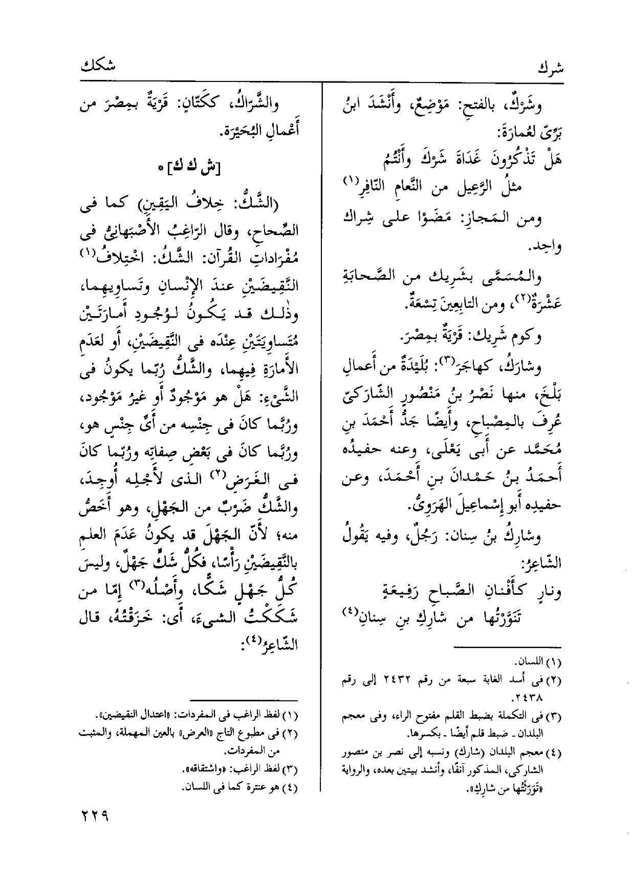 وَمن المَجازِ: مَضَوْا على شِراك واحِد. والمُسَمَّى بشَرِيك من الصَّحابَةِ عَشْرَة، وَمن التابِعِينَ تسعَة. وكوم شَرِيك: قريَةٌ بمِصْرَ. وشارَكُ، كهاجَرَ: بلَيدَةٌ من أَعمالِ بَلْخَ، مِنْهَا نَصْرُ بنُ مَنْصُورٍ الشّارَكي عُرِفَ بالمِصْباحِ، وأَيضاً جَدّ أَحْمَدَ بنِ مُحَمَّد عَن أبي يَعْلَى، وَعنهُ حفيدُه أَحمَدُ بنُ حَمْدانَ بنِ أَحْمَدَ، وَعَن حفيده أَبو إِسْماعِيلَ الهَرَوِيّ. وشارِكُ بنُ سِنان: رَجُلٌ، وَفِيه يَقُولُ الشّاعِرُ: