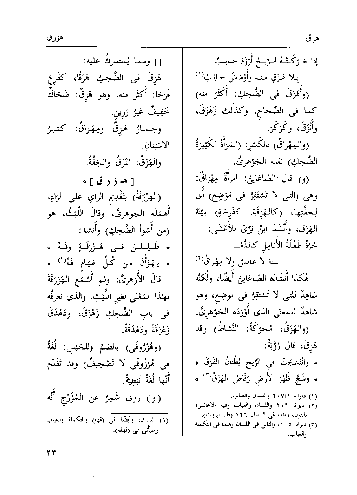 الهَزْرَقَة بتَقْدِيمِ الزَّاي على الرّاءِ، أَهمَلَه الجوهريُّ، وقالَ اللّيثُ، هُوَ من أَسْوأ الضَّحِكِ وأَنشد: ظَلِلنَ فِي هَزْرَقَة وقَهِّ يَهْزَأْنَ من كُلِّ عَيَامٍ فَهِّ قالَ الأَزهريّ: وَلم أَسْمَع الهَزْرَقَةَ بِهَذَا المَعْنَى لغيرِ اللَّيثِ، وَالَّذِي نعرِفُه فِي بابِ الضَّحِكِ زَهْزَقَ، ودَهْدَقَ زَهْزَقَةً ودَهْدَقَةً. وهُزْرُوقَى بالضمِّ للحَبسِ: لُغَةٌ فِي هرزُوقَى لَا تَصْحِيفٌ وَقد تَقَدّم أَنّها لُغَةٌ نَبَطِيَّةٌ. وروى شَمِرٌ عَن المُؤَرِّجِ أَنّه