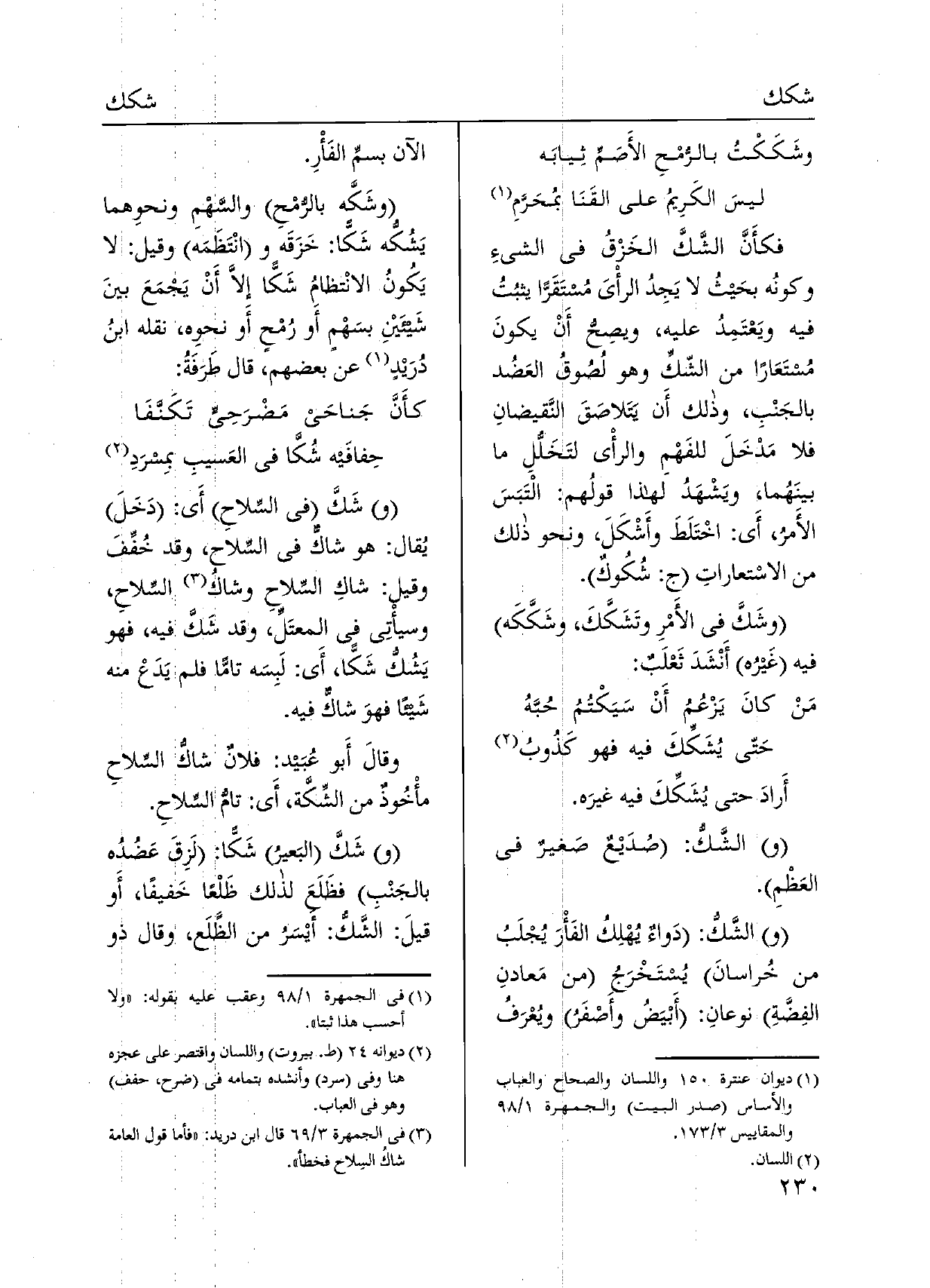 فكأَنَّ الشَّكَّ الخَزْقُ فِي الشَّيْء وكونُه بحَيثُ لَا يَجِدُ الرَّأْي مُستَقَرًّاً يثبُتُ فِيهِ ويَعْتَمِدُ عَلَيْهِ، ويصِح أَنْ يكونَ مُستَعَاراً من الشّكِّ وَهُوَ لُصُوقُ العَضُد بالجَنْبِ، وَذَلِكَ أَن يَتَلاصَقَ النَّقيضانِ فَلَا مَدْخَلَ للفَهْمِ والرأي لتَخَلُّلِ مَا بينَهُما، ويَشْهَدُ لهَذَا قولُهم: الْتَبَسَ الأَمرُ، أَي: اخْتَلَطَ وأَشْكَلَ، وَنَحْو ذَلِك من الاسْتعاراتِ} شُكوكٌ. {وشَكَّ فِي الأَمْرِ} وتَشَكَّكَ، وشَكَّكَه فِيهِ غَيرُه أَنْشَدَ ثَعْلَبٌ: