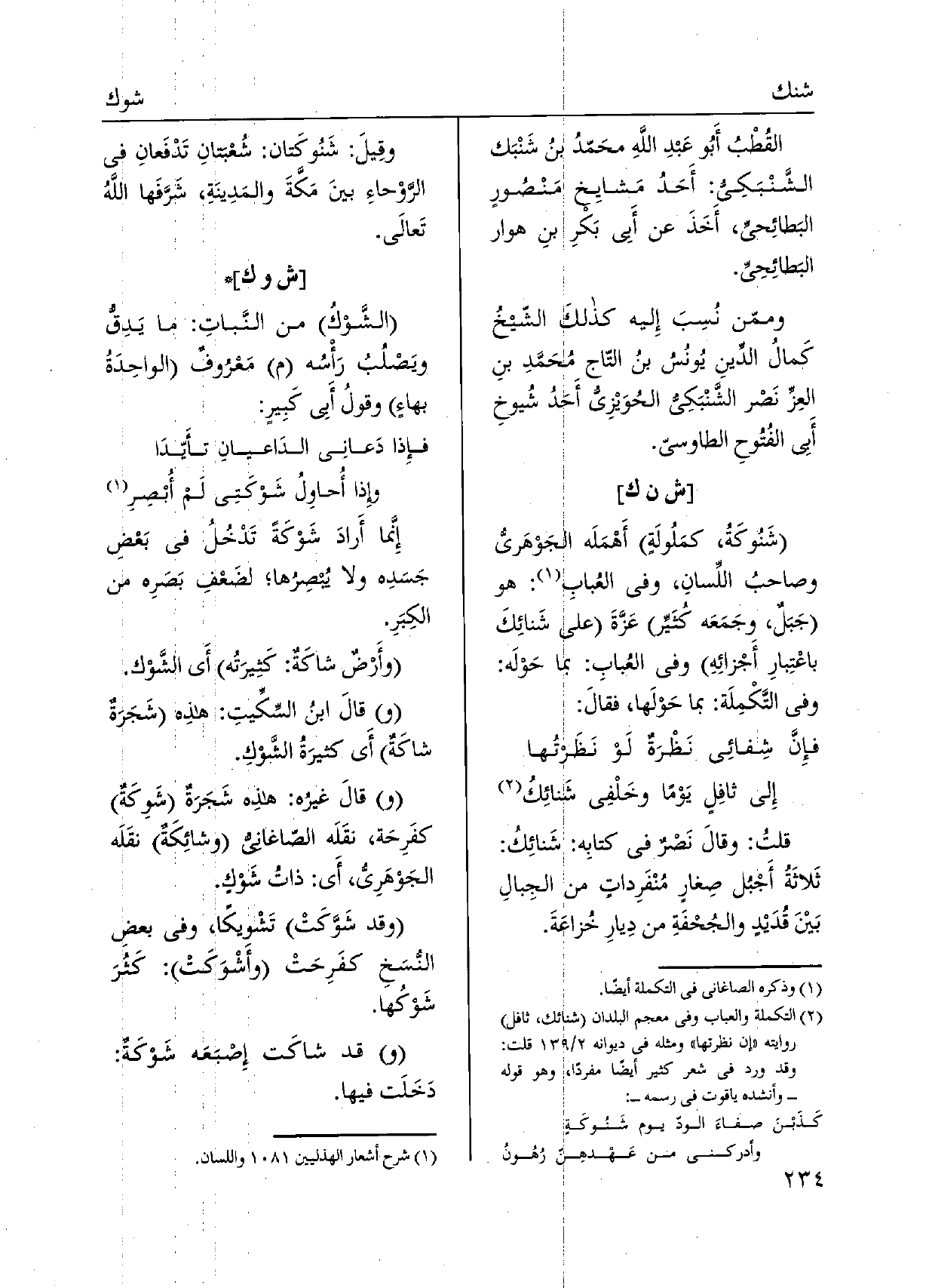 وقِيلَ: شَنُوكَتان: شُعْبتانِ تَدْفَعانِ فِي الرَوْحاءِ بينَ مَكَّةَ والمَدِينَةِ، شَرَّفَها اللَّهُ تَعالَى.