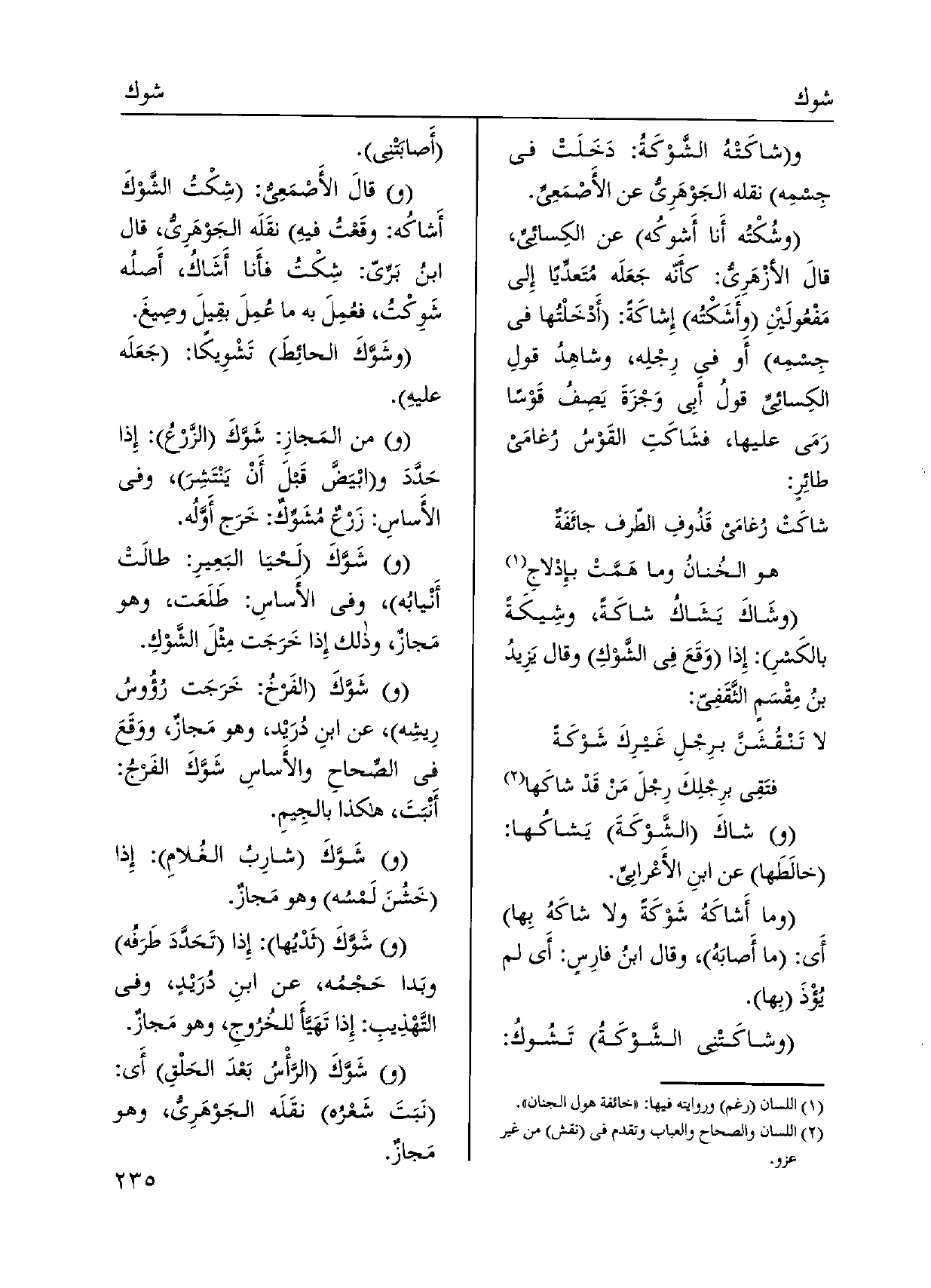 (و) } شاكَ الشَّوْكَةَ يَشاكُها: خالَطَها عَن ابنِ الأَعْرابيِّ. وَمَا {أَشاكَهُ شَوْكَةً وَلَا} شاكَهُ بِها أَي: مَا أَصابَهُ، وَقَالَ ابنُ فارِسٍ: أَي لم يُؤْذَ بِها. {وشاكَتْني الشَّوْكَةُ} تَشُوكُ: أَصابَتْني. وقالَ الأَصْمَعِي: {شِكْتُ الشَّوْكَ أَشاكُه: وقَعْتُ فيهِ نقَلَه الجَوْهَرِيُّ، قَالَ ابنُ بَرِّيّ: شِكْتُ فأَنا} أَشَاكُ، أَصلُه {شَوِكْتُ، فعُمِلَ بِهِ مَا عُمِلَ بقِيلَ وصِيغَ.} وشَوَّكَ الحائِطَ {تَشْوِيكًا: جَعَلَه عليهِ. وَمن المَجازِ:} شَوَّكَ الزَّرْعُ: إِذا حَدَّدَ وابْيَضَّ قَبلَ أَنْ يَنْتَشِرَ، وَفِي الأَساسِ: زَرْعٌ! مُشَوِّكٌ: خَرَج أَوَّلُه.