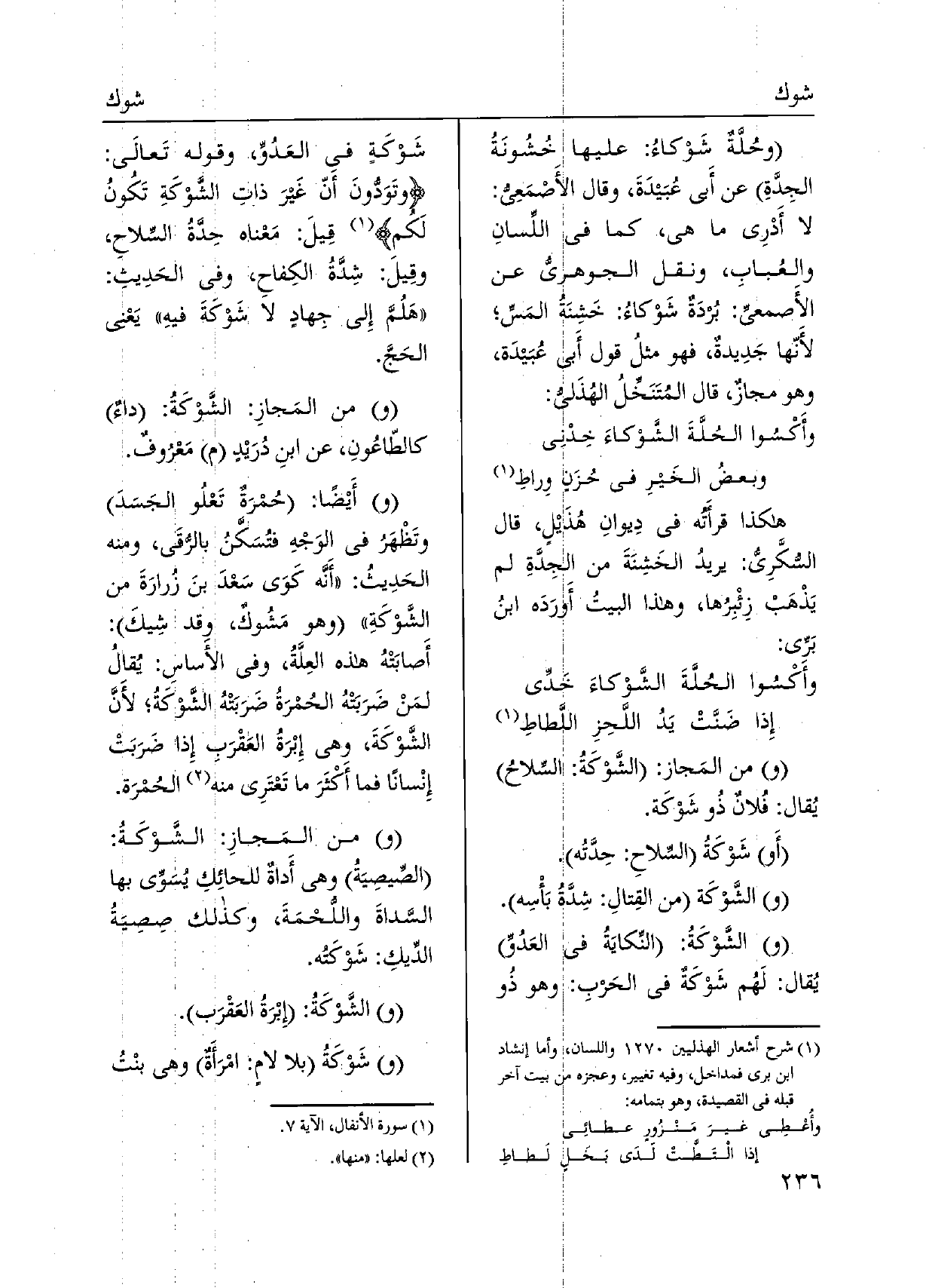 والشَّوْكَةُ: النِّكايَةُ فِي العَدُوِّ يُقال: لَهُم شَوْكَةٌ فِي الحَربِ: وَهُوَ ذُو شَوْكَةٍ فِي العَدُوِّ، وَقَوله تَعالَى: وتَوَدُّونَ أَنّ غَيرَ ذاتِ الشَّوْكَةِ تَكُونُ لَكم قِيلَ: مَعْناه حِدَّةُ السِّلاحِ، وقِيلَ: شِدَّةُ الكِفاح، وَفِي الحَدِيث: هَلُمَّ إِلى جِهادٍ لَا شَوْكَةَ فيهِ يَعْني الحَجَّ. وَمن المَجازِ: الشَّوكَةُ: داءٌ كالطّاعُونِ، عَن ابنِ دُرَيْدٍ مَعْروفٌ. وأَيْضًا: حُمْرَةٌ تَعْلُو الجَسَدَ وتَظْهَرُ فِي الوَجْهِ فتُسَكَّنُ بالرُّقَى، وَمِنْه الحَدِيث: أَنَّه كَوَى سَعْدَ بنَ زُرارَةَ من الشَّوْكَة وَهُوَ {مَشُوكٌ، وِقد شِيكَ: أَصابَتْهُ هَذِه العِلَّةُ، وَفِي الأساسِ: يُقالُ لمَنْ ضَرَبَتْهُ الحُمْرَةُ ضَرَبَتْهُ الشَّوْكَةُ لأَنَّ الشَّوْكَةَ، وَهِي إِبْرَةُ العَقْرَبِ إِذا ضَرَبَتْ إِنْسانًا فَمَا أَكْثَرَ مَا تَعْتَرِي مِنْهُ الحُمْرَة. وَمن المَجازِ: الشَّوْكَةُ: الصِّيصِيَةُ وَهِي أَداةٌ للحائِكِ يُسَوِّي بهَا السَّداةَ واللُّحْمَةَ، وَكَذَلِكَ صِصِيَةُ الدِّيكِ:} شَوْكَتُه. والشَّوْكَةُ: إِبْرَةُ العَقْرَب. وشَوْكَةُ بِلَا لامٍ: امْرَأَةٌ وَهِي بنْتُ