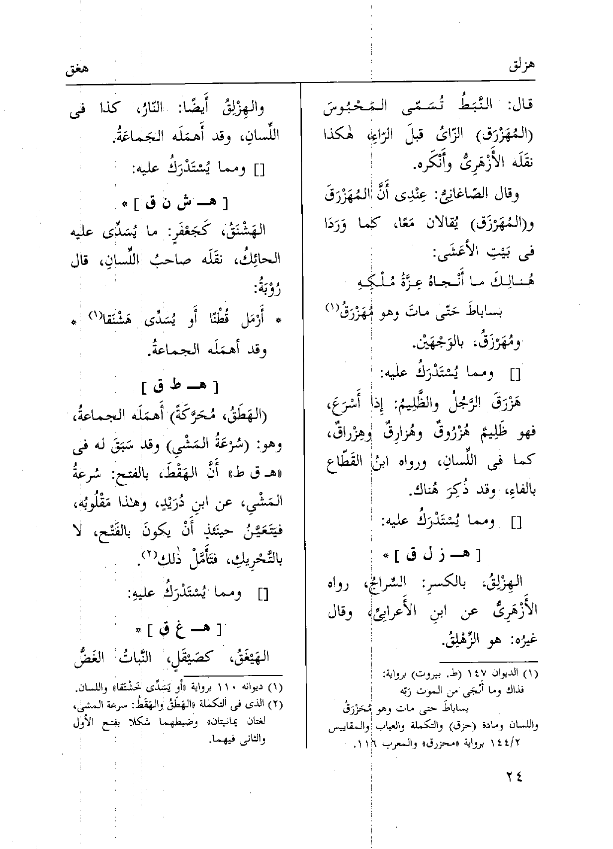 وَمِمَّا يُستَدْرَكُ عَلَيْهِ: هَزْرَقَ الرَّجُلُ والظَّلِيمُ: إِذا أَسْرَعَ، فَهُوَ ظَلِيمٌ هُزْرُوقٌ وهُزارِقٌ وهِزْراقٌ، كَمَا فِي اللِّسانِ، وَرَوَاهُ ابنُ القَطّاع بالفاءِ، وَقد ذُكِرَ هُناك.