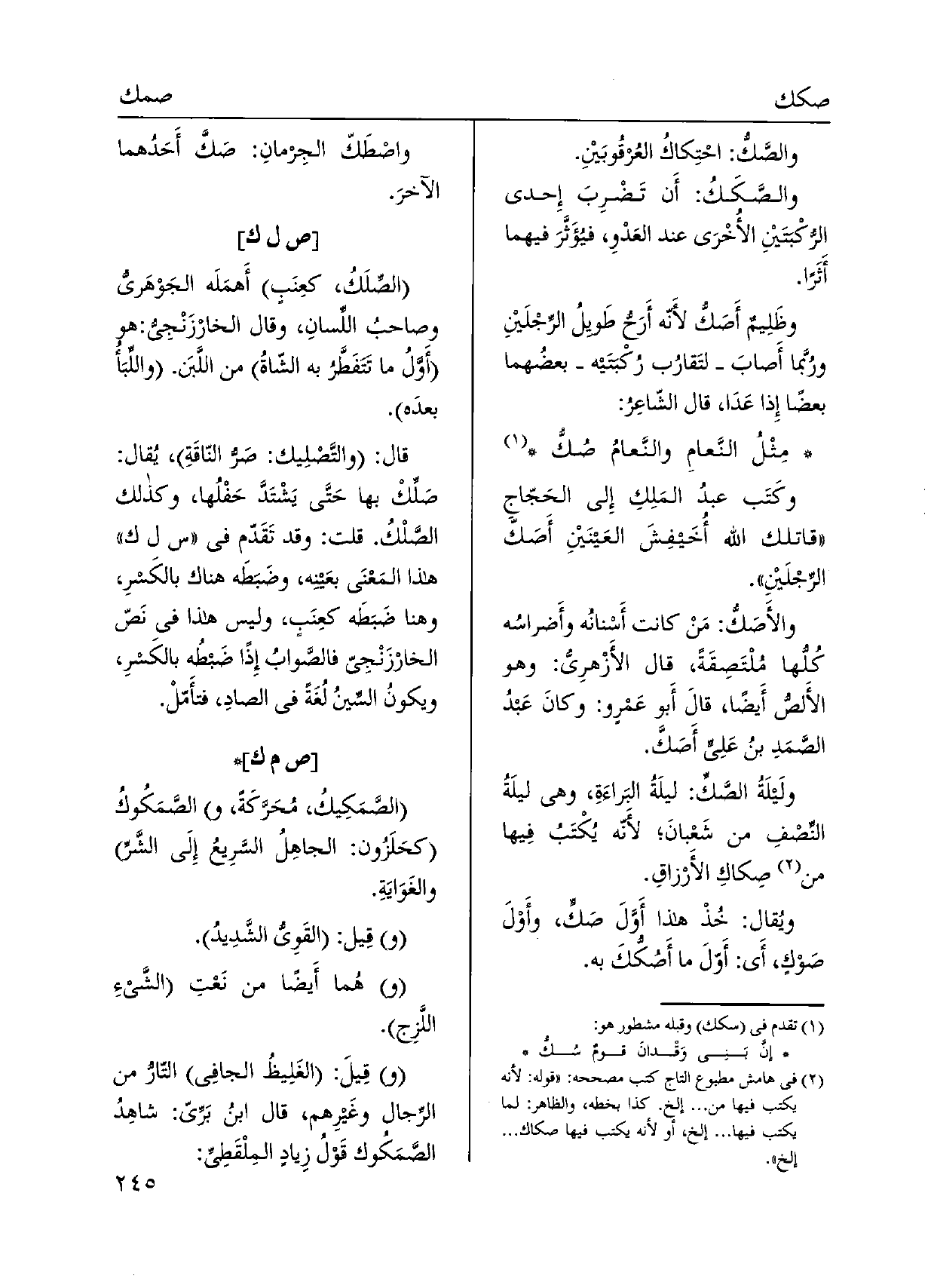 {والصكُّ: احْتِكاكُ العُرقُوبَيْنِ.} والصَّكَكُ: أَن تَضْرِبَ إِحدى الرُّكْبتَين الأخْرَى عِنْد العَدْوِ، فيُؤَثَّرَ فيهمَا أَثَراً. وظَلِيمٌ {أَصَكُّ لأَنّه أَرَحُّ طَويل الرِّجْلَيْنِ ورُّبما أَصابَ لتَقارُب رُكْبتَيه بعضُهما بَعْضًا إِذا عَدَا، قَالَ الشّاعِرُ: مِثْلُ النَّعامِ والنَّعامُ} صكُّ وكَتَب عبدُ المَلِكِ إِلى الحَجّاج قَاتلك الله أُخَيفِش العَينَيْنِ أَصَكَّ الرَجلَين. {والأَصَكّ: مَنْ كَانَت أَسْنانُه وأَضراسُه كُلُّها مُلْتَصِقَةً، قَالَ الأَزْهرِيُّ: وَهُوَ الأَلصُّ أَيضًا، قالَ أَبو عَمْرو: وكانَ عَبدُ الصَّمَدِ بنُ عَلِي أَصَكَّ. ولَيلَةُ} الصَّكِّ: ليلَةُ البَراءةِ، وَهِي ليلَةُ النِّصْفِ من شَعْبانَ لأَنّه يُكْتَبُ فِيها من صِكاكِ الأَرْزاقِ. ويُقال: خُذْ هَذَا أَوَّلَ {صَك، وأَوْلَ} صَوْك، أَي: أَوّلَ مَا {أَصُكّكَ بِهِ.} واصْطَكّ الجِرمانِ: صَكَّ أَحَدُهما الآخرَ.