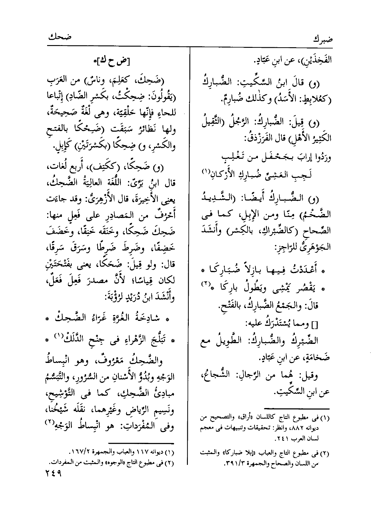 والضبارِكُ أَيضًا: الشَّدِيدُ الضَّخْمُ مِنّا وَمن الإبِلِ، كَمَا فِي الصِّحاحِ كالضِّبراكِ، بَالكِسر وأَنشَدَ الجَوْهَرِي للرّاجِزِ: أَعْدَدْتُ فِيها بازِلاً ضُبَارِكَا يَقْصُر يَمْشِي ويَطُولُ بارِكَا قالَ: والجَمْعُ الضَّبارِكُ، بالفَتْحِ.