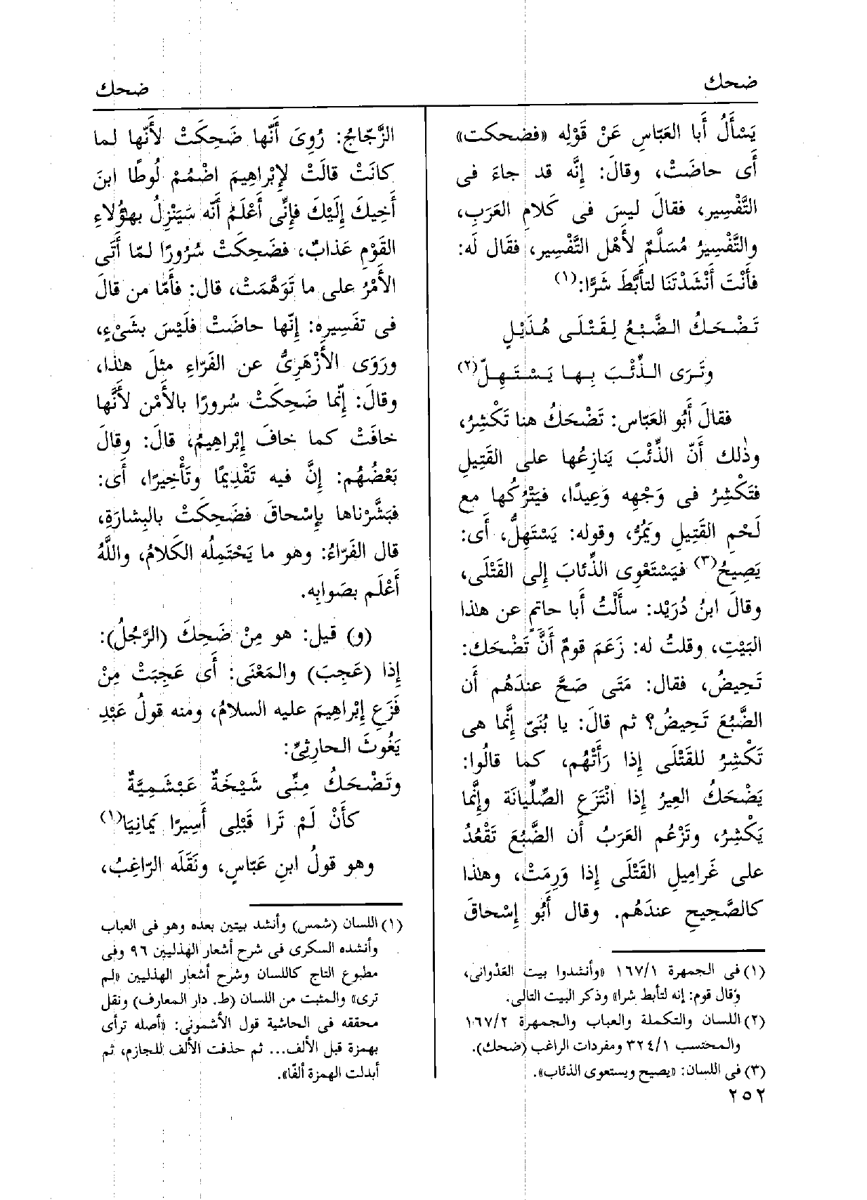 القَتِيلِ وَيمُرّ، وَقَوله: يَستَهِلُّ، أَي: يَصِيحُ فيَستَعْوي الذِّئابَ إِلى القَتْلَى، وقالَ ابنُ دُرَيْد: سأَلْتُ أَبا حاتمٍ عَن هَذَا البَيتِ، وقلتُ لَهُ: زَعَمَ قومٌ أَنًّ تَضْحَك: تَحِيضُ، فَقَالَ: مَتَى صَحَّ عندَهُم أَن الضَّبُعَ تَحِيضُ ثمَّ قالَ: يَا بُنَي إِنَّما هِيَ تَكْشِرُ للقَتْلَى إِذا رَأَتْهُم، كَمَا قالُوا: يَضْحَك العِير إِذا انْتَزَع الصِّلِّيانَة وِإنَّما يَكْشِرُ، وتَزْعُم العَرَبُ أَن الضَّبُعَ تَقْعدُ على غَرامِيلِ القَتْلَى إِذا وَرِمتْ، وَهَذَا كالصَّحيحِ عندَهُم. وَقَالَ أَبُو إِسْحاقَ الزَّجّاج: رُوِيَ أنّها ضَحِكَتْ لأنّها لما كَانَت قالَتْ لإِبْراهِيمَ اضْمُمْ لُوطًا ابنَ أَخِيكَ إِلَيْكَ فإنّي أَعْلَمُ أَنّه سَيَنْزِلُ بهؤُلاءِ القَوْمِ عَذابٌ، فضَحِكَتْ سُرُورًا لمّا أَتَى الأَمْر على مَا تَوَهَّمَتْ، قَالَ: فأَمّا من قالَ فِي تفَسِيره: إِنّها حاضَتْ فلَيسَ بشَيءٍ، ورَوَى الأَزْهَرِيُّ عَن الفَرّاءِ مثلَ هَذَا، وقالَ: إِنّما ضَحِكَتْ سُرورًا بالأَمْن لأَنَّها خافَتْ كَمَا خافَ إِبْراهِيمُ، قالَ: وقالَ بَعْضُهُم: إِنَّ فِيهِ تَقْدِيمًا وتَأْخِيرًا، أَي: فبَشَّرناها بإسْحاقَ فضَحِكَتْ بالبِشارَةِ، قَالَ الفَرّاءُ: وَهُوَ مَا يَحْتَمِلُه الكَلامُ، واللَّهُ أَعْلَم بصَوابِه.