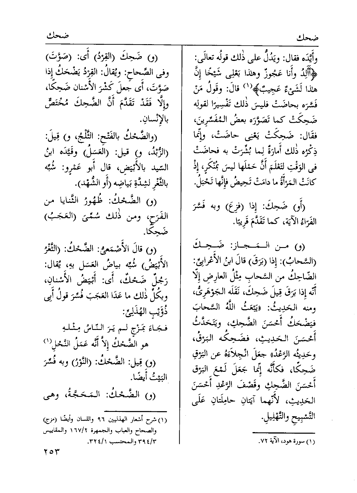 وأَيَّدَه فَقَالَ: ويَدُلُّ على ذَلِك قَوْله تعالَى: أأَلِدُ وأَنا عَجُوزٌ وَهَذَا بَعْلي شَيخًا إِنَّ هَذَا لَشَيءٌ عَجِيبٌ قالَ: وقَولُ مَنْ فَسَّرَه بحاضت فليسَ ذَلِك تَفْسِيراً لقولِه ضَحِكَتْ كَمَا تَصَوَّرَه بعضُ المُفَسِّرِينَ، فقَال: ضَحِكَتْ يَعْنِي حاضَتْ، وإِنّما ذِكْرُه ذَلِك أَمارَةٌ لِما بُشِّرَتْ بِهِ فحاضَتْ فِي الوَقْتِ لتَعْلَمَ أَنَّ حَمْلَها ليسَ بمُنْكَرٍ، إِذْ كَانَت المَرأَةُ مَا دامَتْ تَحِيضُ فإِنَّها تَحْبَلُ. أَو ضَحِكَ: إِذا فزِعَ وَبِه فَسَّرَ الفَرّاءُ الآيَة، كَمَا تَقَدَمَ قَرِيبًا. وَمن المَجاز: ضَحِكَ السَّحابُ: إِذا بَرَقَ قالَ ابنُ الأَعْرابي: الضّاحِكُ من السَّحابِ مِثْلُ العارِضِ إِلا أَنّه إِذا بَرَقَ قِيلَ ضَحِكَ، نَقَلَه الجَوْهَرِيُّ، وَمِنْه الحَدِيثُّ: يَبعَث اللَّهُ السَّحابَ فيًضْحَكُ أَحْسَنَ الضحِكِ، ويَتَحَدَّثُ أَحْسًنَ الحَدِيثِ، فضَحِكُه البًرقُ، وحَدِيثُه الرَّعْدُ جعَلَ انْجِلاَءه عَن البَرقِ ضَحِكاً، فَكَأَنَّهُ إِنّما جَعَلَ لَمْعَ البَرق أَحْسَنَ الضَّحِكِ وقَصْفَ الرَّعْدِ أَحْسَنَ الحَدِيثِ، لأَنّهما آيَتانِ حامِلَتانِ عَلَى التَّسبِيحِ والتَّهْلِيلِ. وضَحِكَ القردُ أَي: صَوَّتَ وَفِي الصِّحاحِ: ويُقالُ: القِردُ يَضْحَكُ إِذا صَوَّتَ، أَي جعلَ كَشْرَ الأَسْنان ضَحِكًا، وِإلا فَقَدْ تَقَدَّمَ أَنَّ الضًّحِكَ مُخْتَصٌّ بالإِنْسانِ.