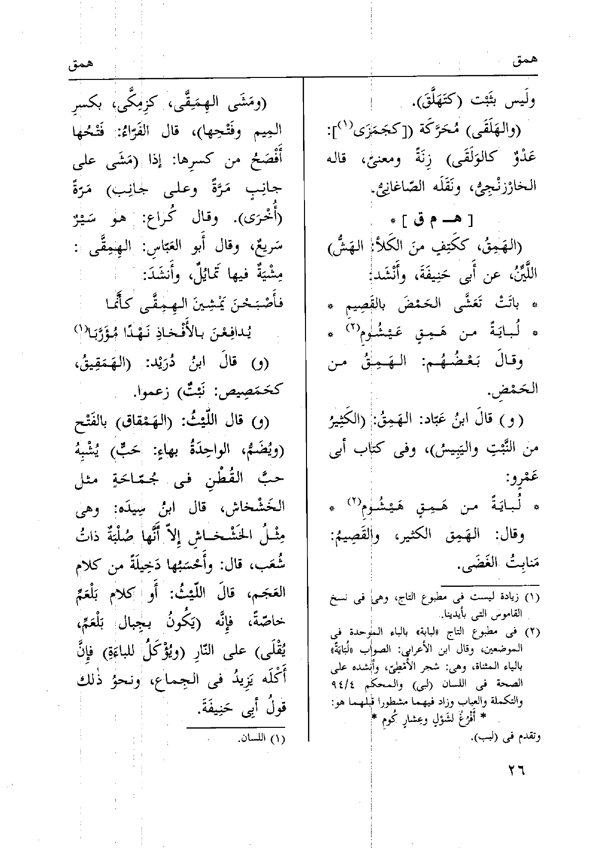 الهَمِقُ، ككَتِفِ منَ الكَلأ: الهَشُّ اللَّيِّنُ، عَن أبي حَنِيفَةَ، وأَنْشَد: باتَتْ تَعَشَّى الحَمْضَ بالقَصِيمِ لُبايَةً من هَمِقٍ عيشُومِ وقالَ بَعْضُهُم: الهَمِقُ من الحَمْضِ. وقالَ ابنُ عَبّاد: الهَمِقُ: الكَثِيرُ من النَّبتِ واليَبِيسُ، وَفِي كتاب أبي عَمْرو: لُبايَةً من هَمِق هَيشُومِ وَقَالَ: الهَمِق الْكثير، والقَصِيمُ: مَنابِتُ الغَضَى. ومَشَى الهمَقَّى، كزِمِكَّى، بكسرِ المِيم وفَتْحِها، قَالَ الفَرّاءُ: فَتْحُها أَفْصَحُ من كسرِها: إِذا مَشَى على جانِبٍ مَرَّةً وعَلى جانِب مَرّةً أُخْرَى. وَقَالَ كُراع: هُوَ سَيرٌ سَريعٌ، وَقَالَ أَبو العَبّاسِ: الهِمِقَّى: مِشْيَةٌ فِيهَا تَمايُلٌ، وأَنشَدَ: